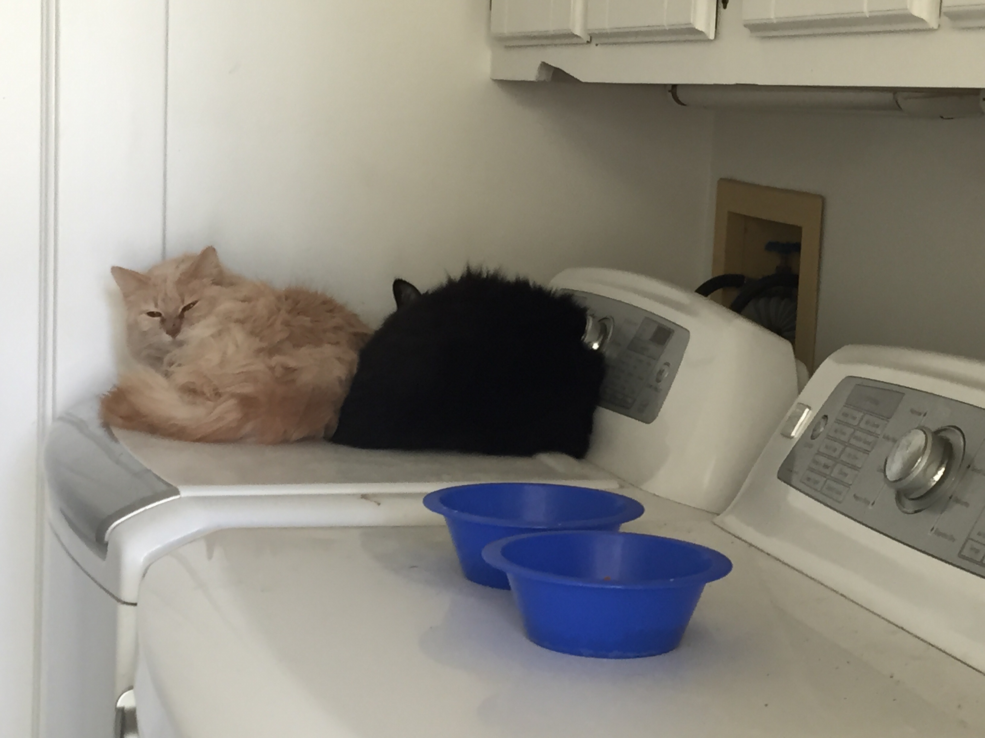 Our two cats, Pepper and Jersey also manage to stay alive with a German Shepard that still thinks they are the coolest animals ever… They tend to hide in the laundry room a lot.