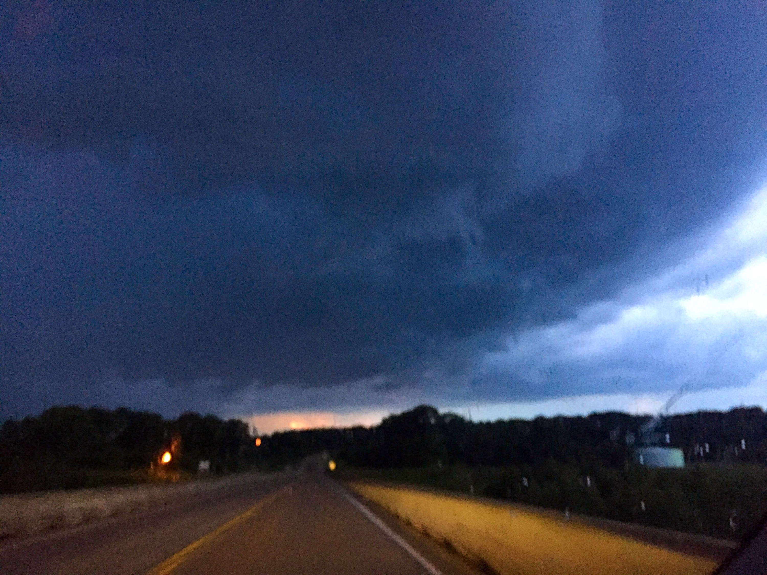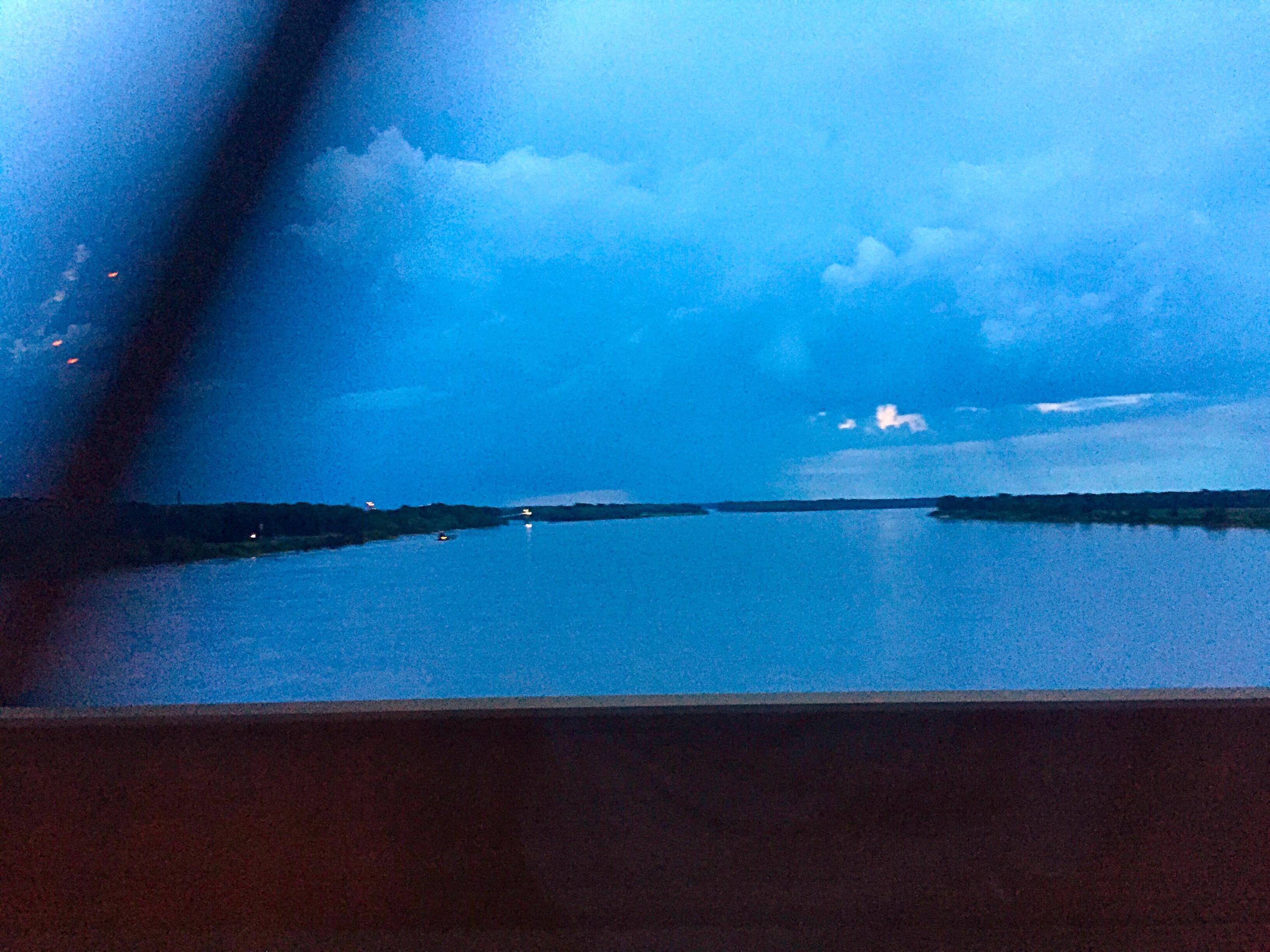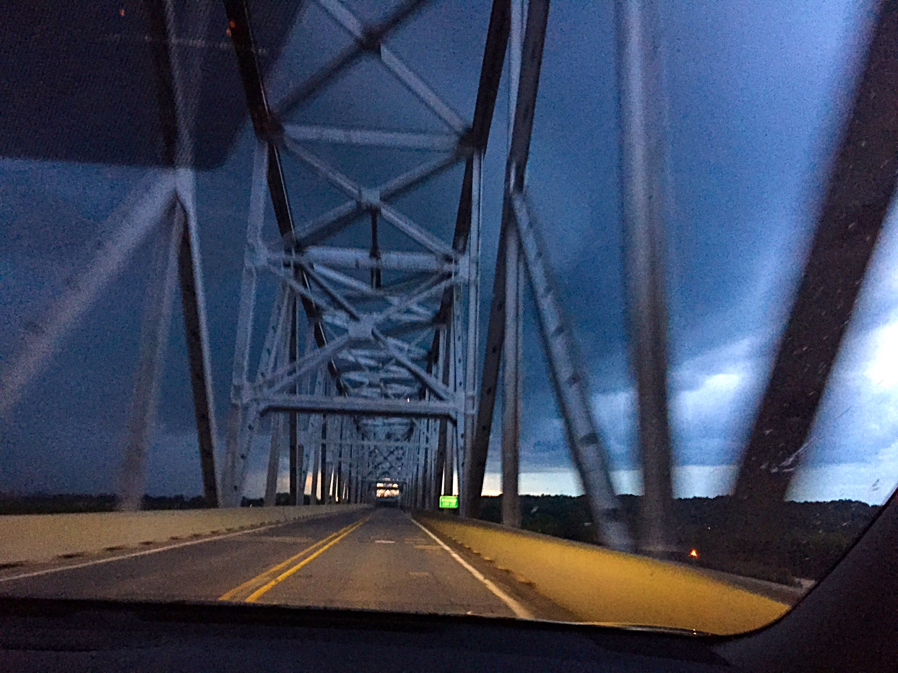 Friday Will had to work fairly late, hoping to beat the rain that never came until Sunday afternoon. We were driving back home over the bridge when one wave of the storm was blowing over, and this is what it looked like: