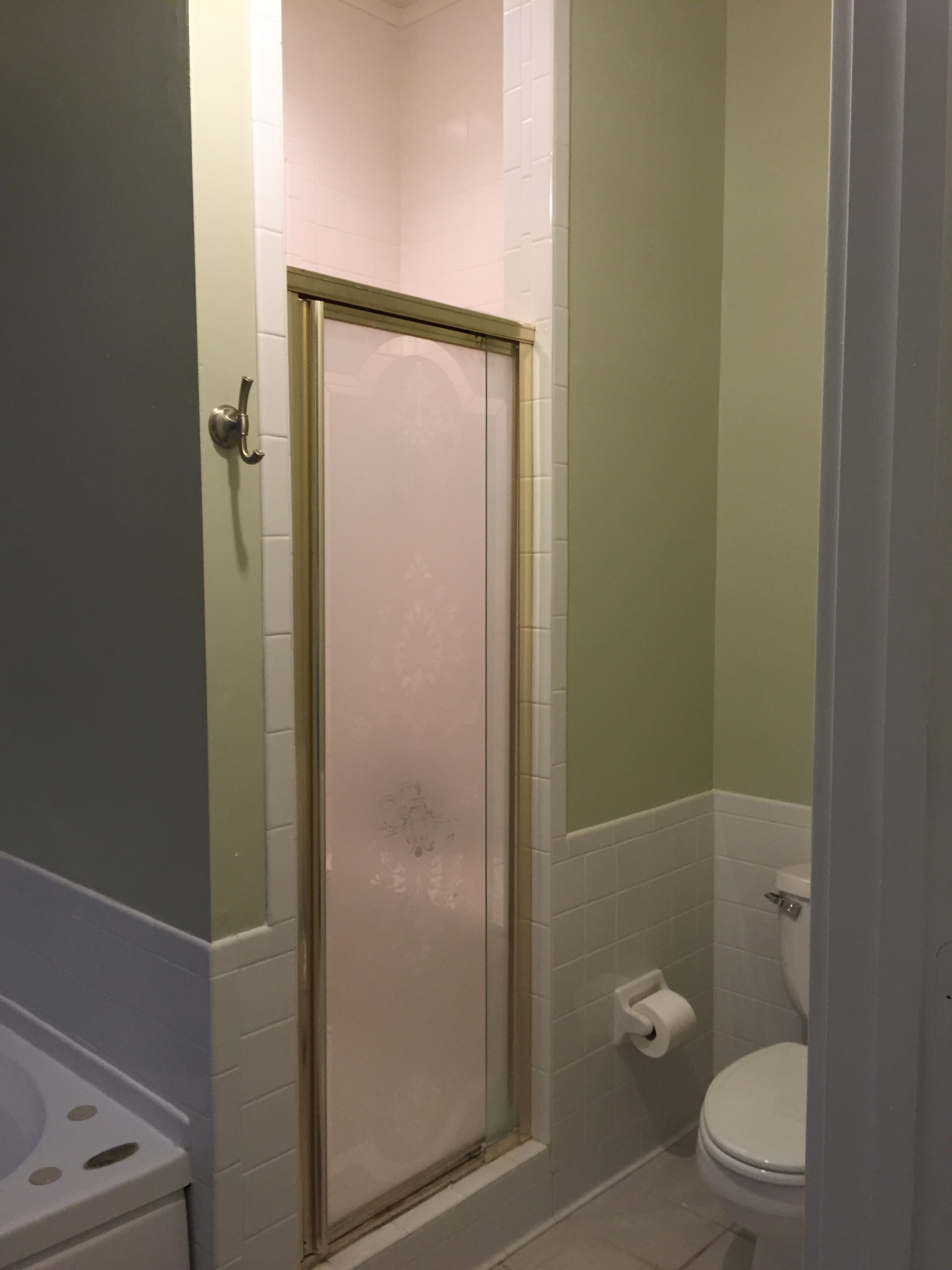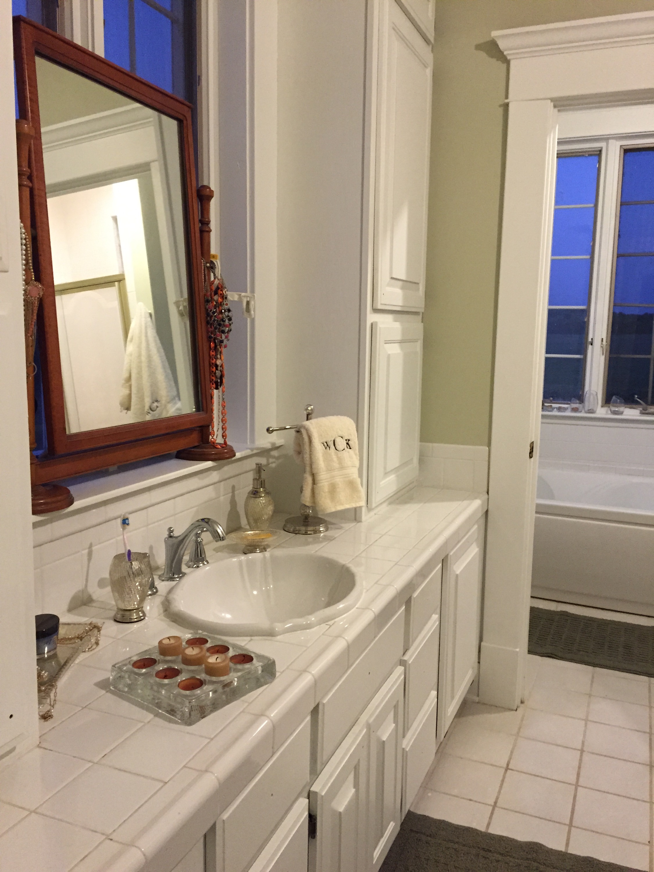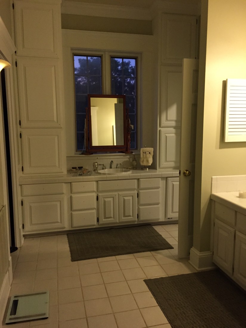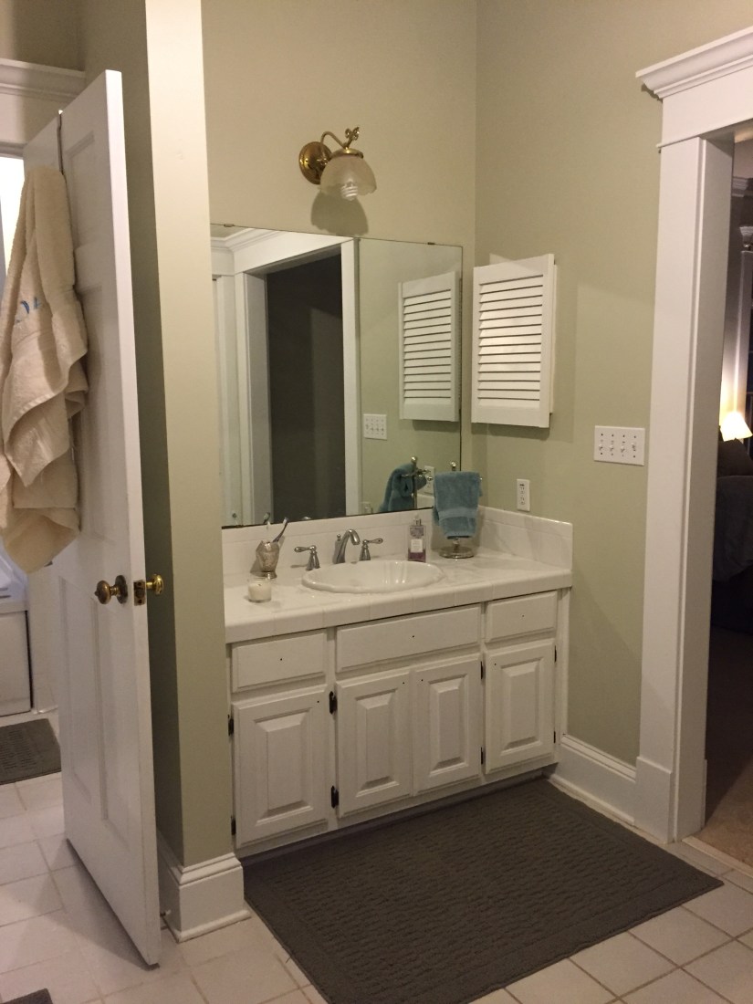 Of course I can’t end a post without leaving you with some pictures of our house!  Today I leave you with pictures of our master bathroom.  We really haven’t done much with it besides clean, paint and re-grout the counter tiles.  One day we want to completely so this bathroom.  For now, this is how it looks!