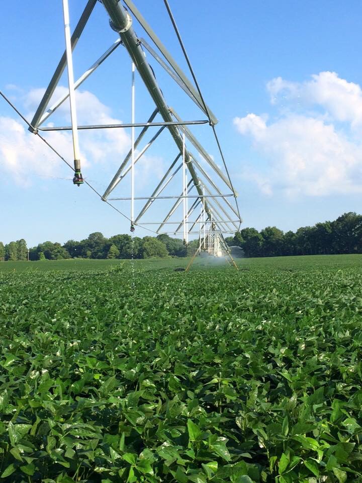 So pretty much EVERYONE else has gotten rain this week… King Farms has some how dodged most of it, or just got a tease of a sprinkling…. Which means they have to “make it rain!” As Will likes to say.  (It also means a little more work involved, but I personally think it looks really cool!). To make it rain they pretty much turn on lots of pivots and poly pipe.  The pivots are what I think look pretty neat- they’re basically HUGE sprinklers.  The pivot also will slowly move in a big circle across the field.  I personally always think they kind of look like dinosaur skeletons.  Maybe that’s just me; I like to think I just have a creative imagination! Anyhow, here is the pivot running over the soybeans directly behind our house: