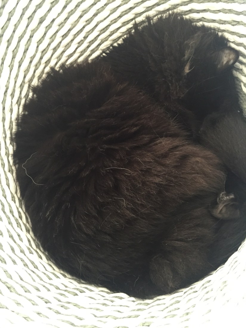Sleeping in a basket- the ultimate warm, small, hide from Well’s, typical Cat Nap.