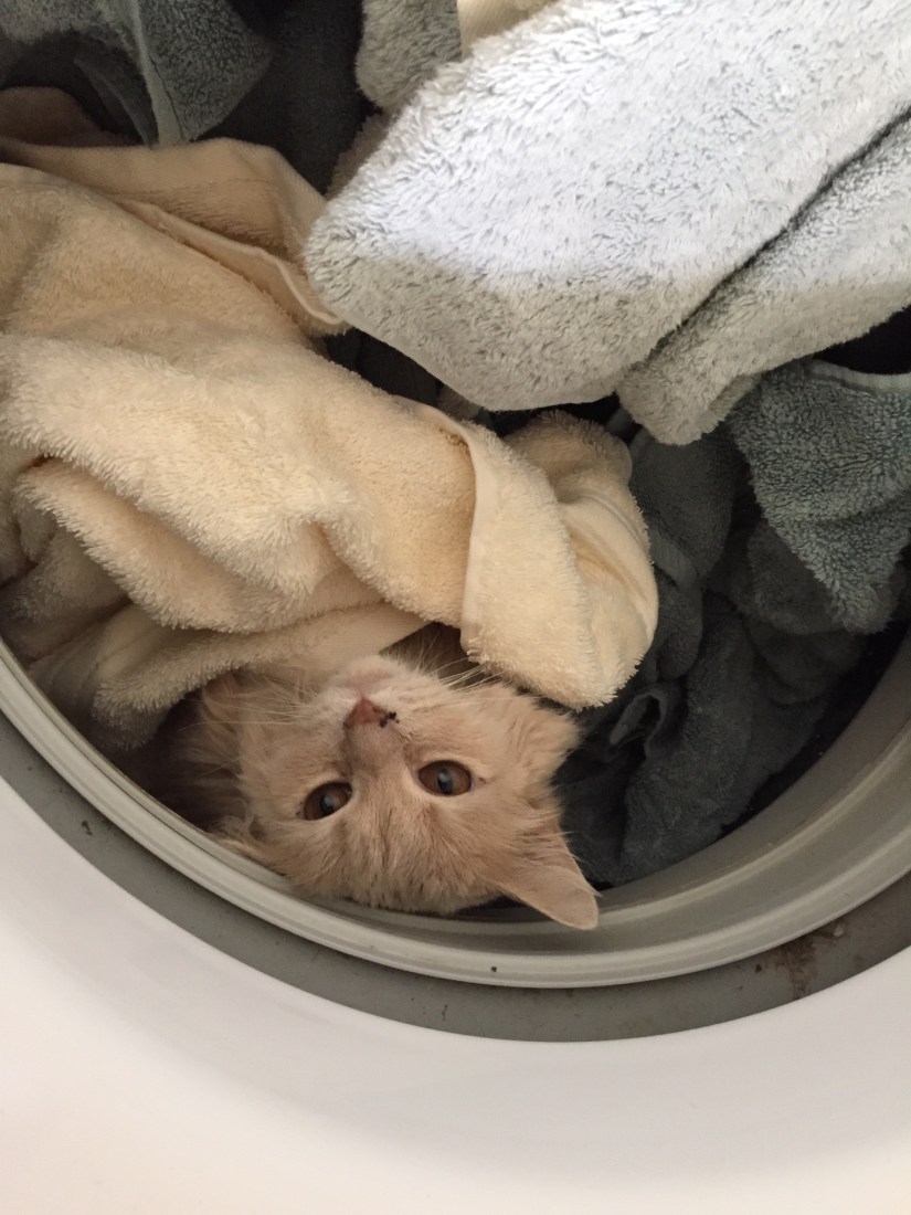 We knew someone that washed or dried their cat with the laundry. I can’t remember which.
