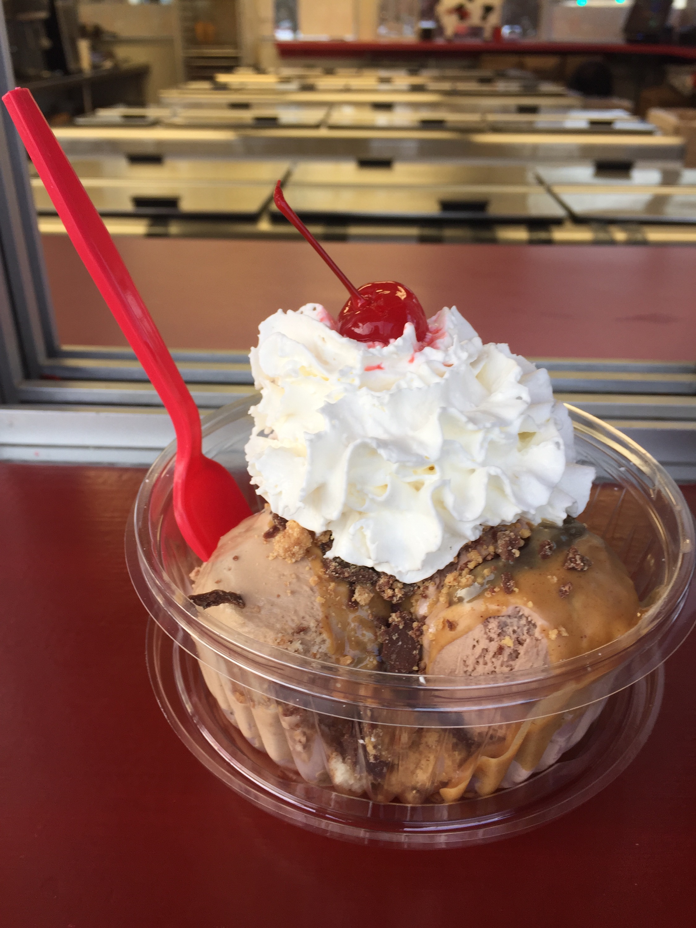 We both got peanut butter cup sundaes- however mine had Graham Central Station Ice Cream (graham cracker ice cream with graham cracker crust and chocolate flakes), Tiramisu Ice Cream (Chocolate-Coffee Cheesecake Ice Cream with Vanilla Wafers and Chocolate Flakes) and Chocolate Peanut Butter Buckeye (Butterfudge Ice Cream, with Peanut Butter and Chocolate Peanut Butter Buckeyes swirled through!) all of that covered with warm peanut butter sauce, hot fudge, and crushed up peanut butter cups, topped with whip cream and a cherry and served in a freshly made waffle bowl!  (I hope your mouth is watering!)