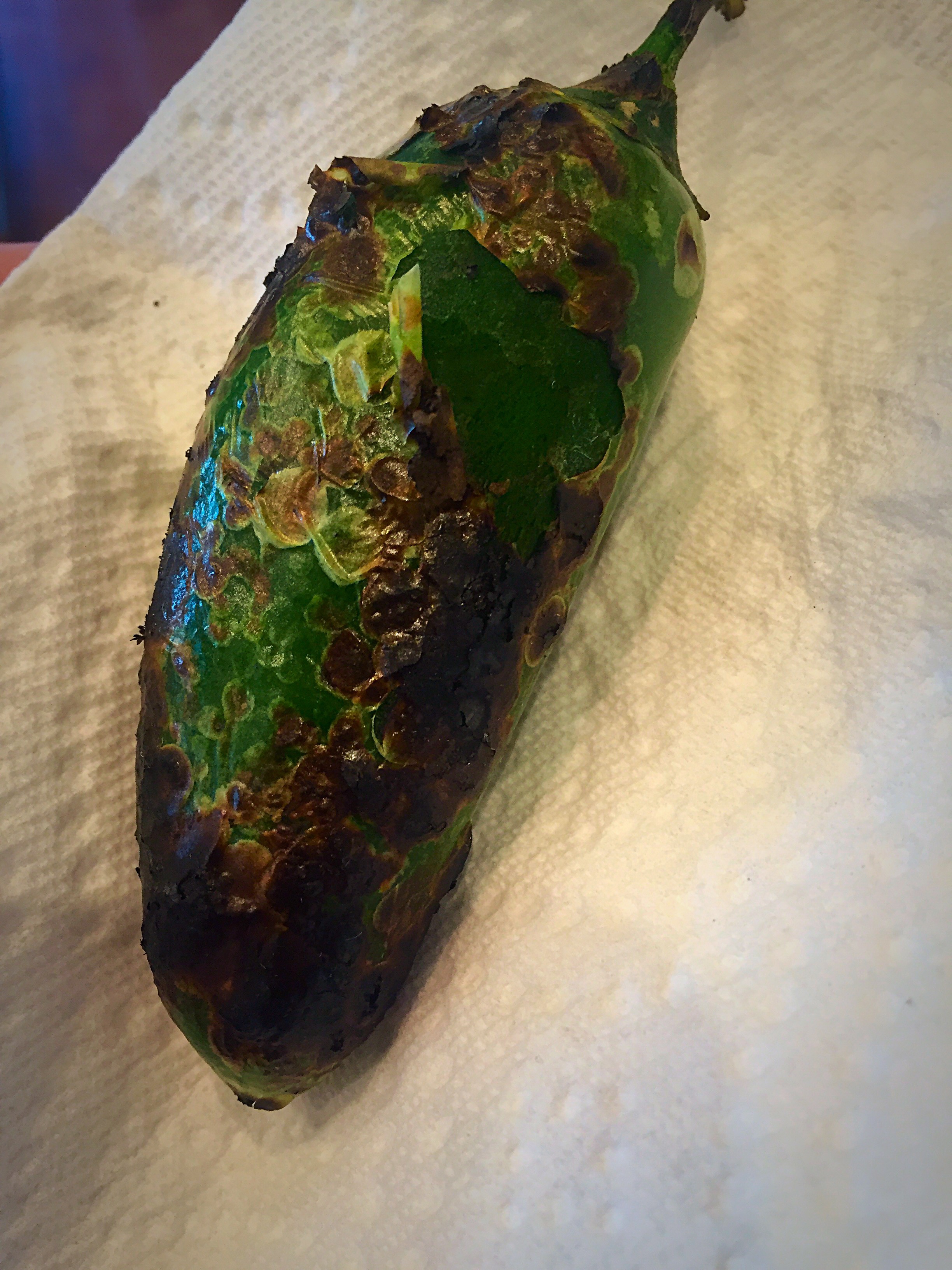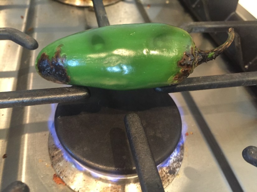 I also read the blog whatsgabycooking.com sometimes, and learned this cool trick for roasting your own jalapeño peppers! It worked great, and they added so much flavor to the frittata! You’ll roast it over an open flame until it looks like my picture/video. When it’s done, you scrape off the burnt peel, and then cut up however much you want to add to your frittata, leaving the seeds out too, or in if you like it HOT!