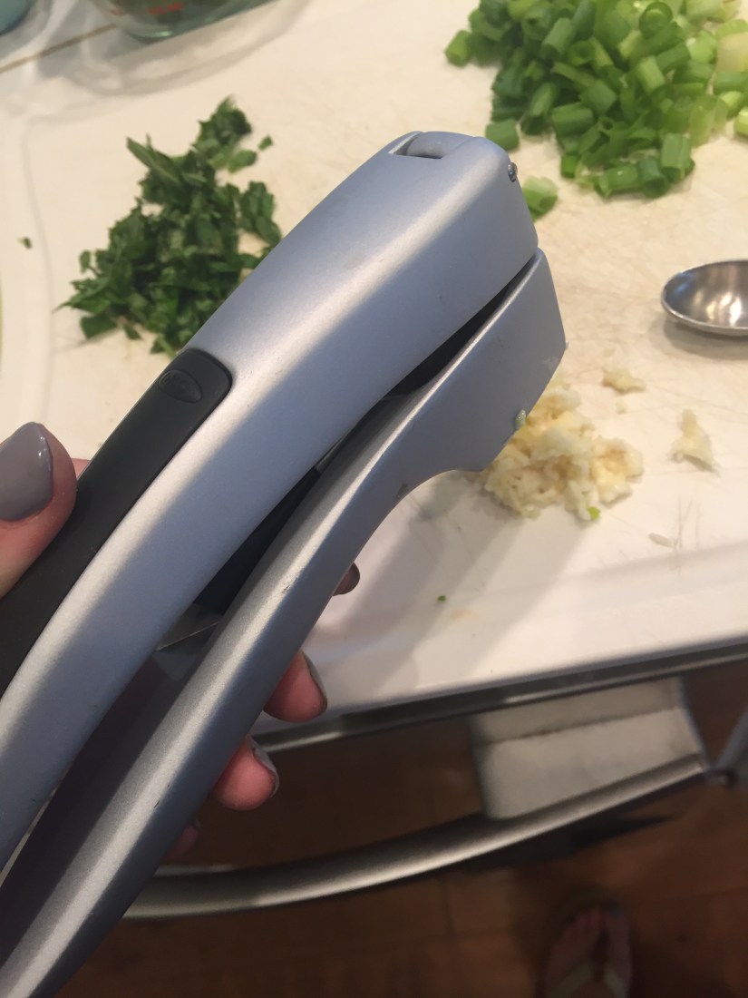When mincing fresh garlic, invest in a garlic press! Seriously, this might be the best and cheapest kitchen tool I have EVER bought! You put the clove inside, with out cutting off ends or peeling, and press- perfect minced garlic EVERY.TIME. We use garlic a lot, so this is a necessity!