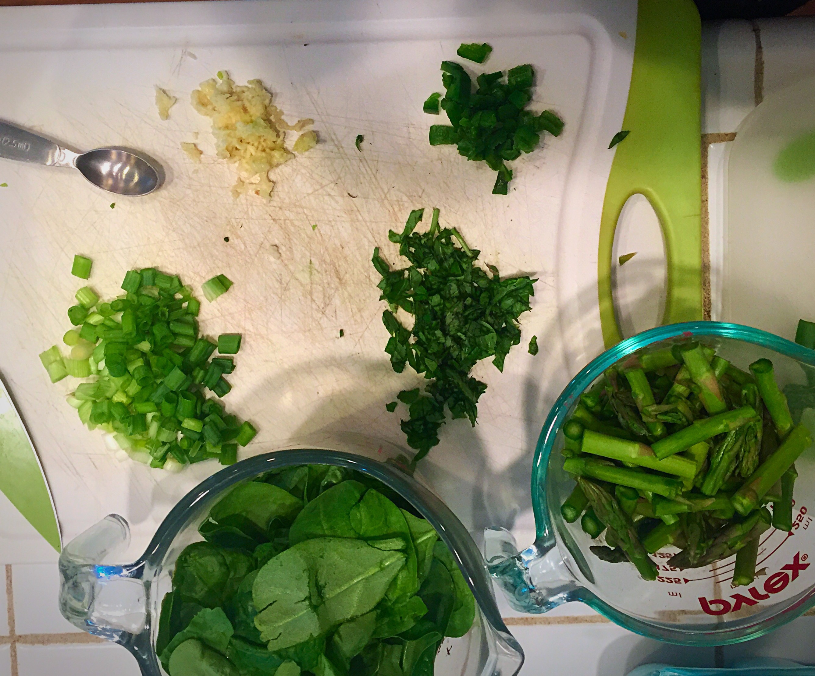 - 1/2lb Asparagus, cut in to 1-inch pieces, about 1C, when cut up