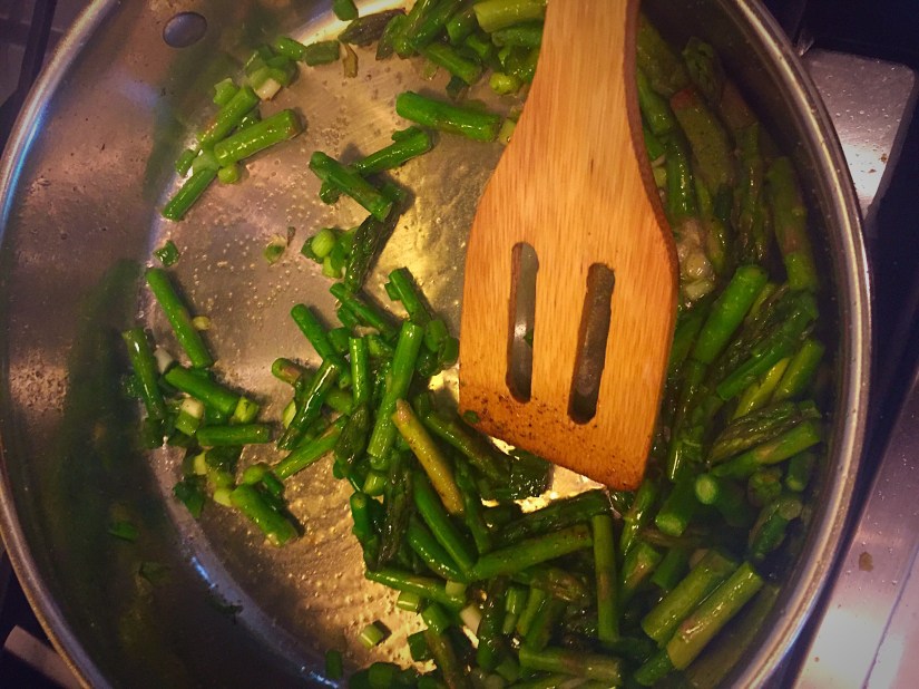 Heat your 2tbsp of olive oil over medium-high heat, and once hot, add in the 1C asparagus, 4 chopped green onions, roasted and chopped jalapeño pepper, salt, and red and black peppers- stir about 3-5minutes or until tender, and slightly brown!