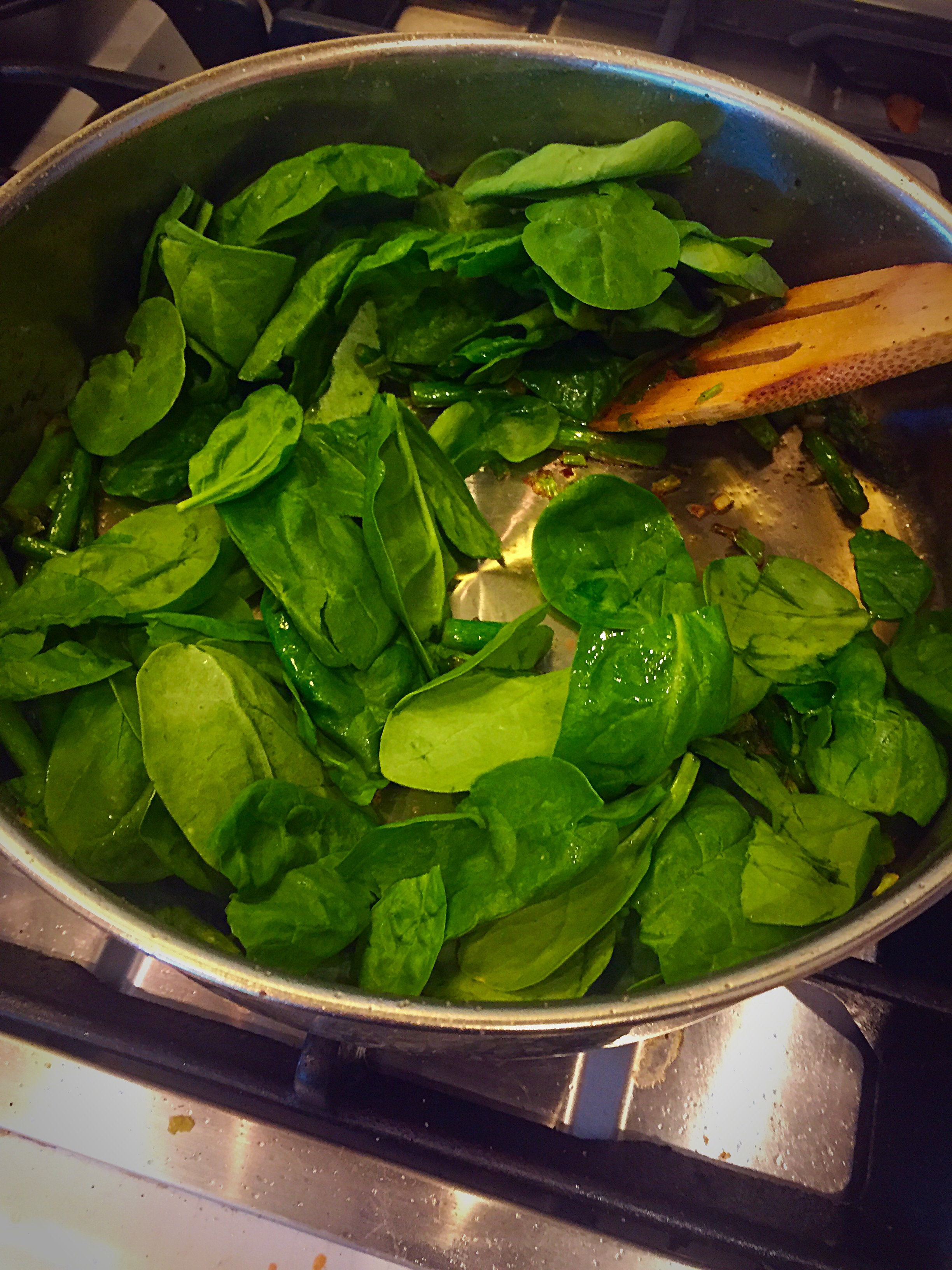 Add in the 2C of spinach, stir constantly for about 1 minute, or until wilted, and then add in your garlic- cook until aromatic, about another minute or less!