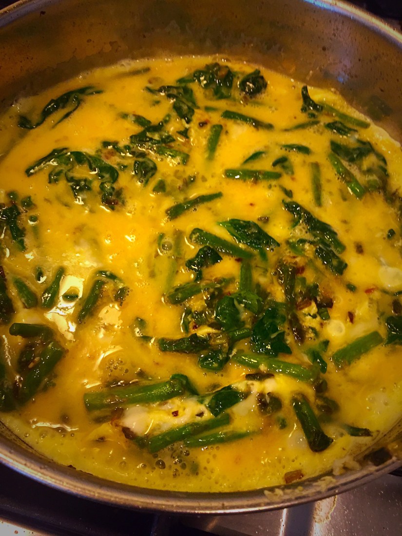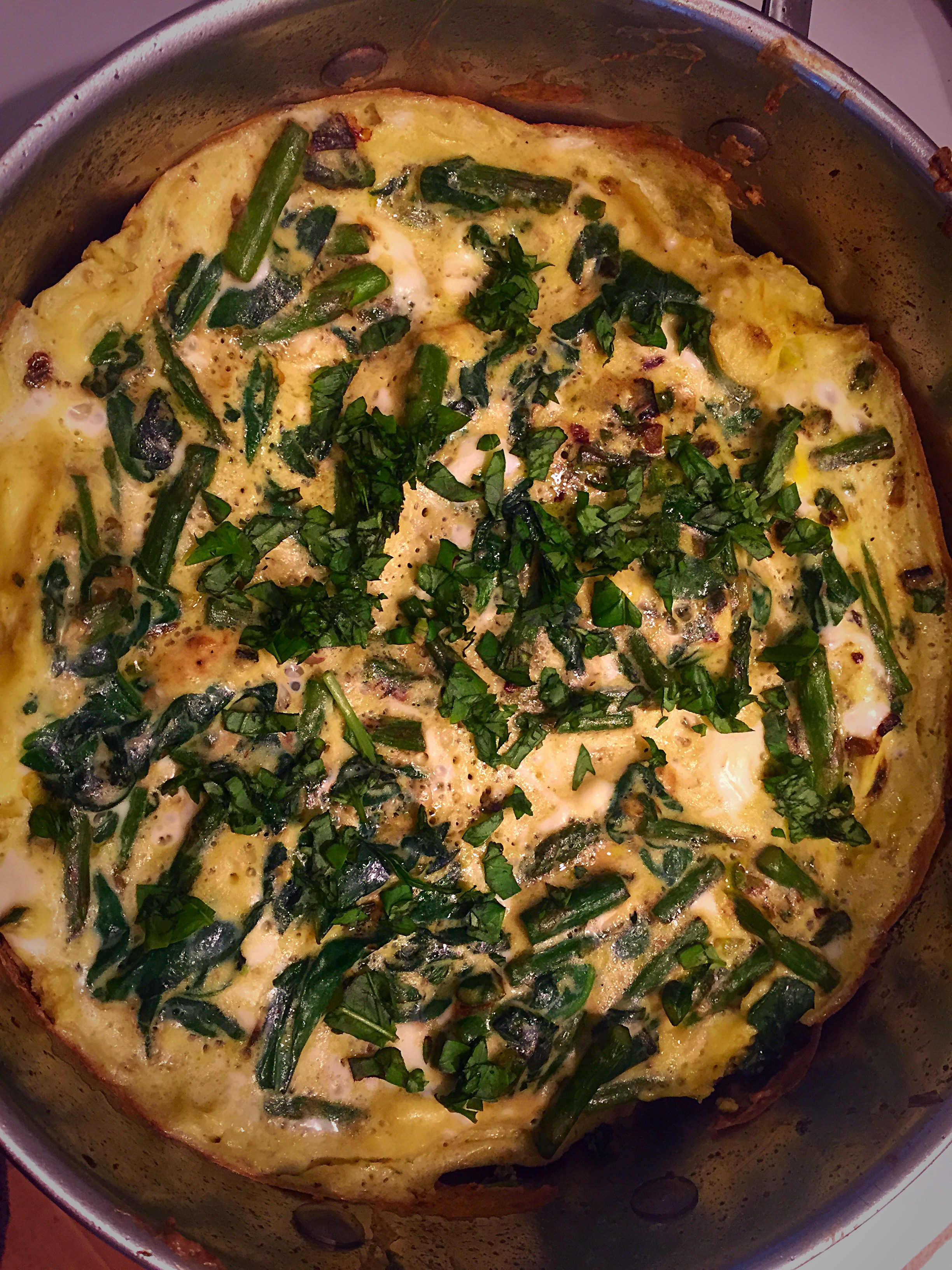 Finally, stir in the 6 beaten eggs, mix fast, and then let it set. In 30-45 second increments, let the eggs cook, without stirring. Using a flat rubber or wooden spatula, pull up the side of the frittata and let the liquid egg from the top, run underneath. Repeat this step until there is no more liquid left on top!