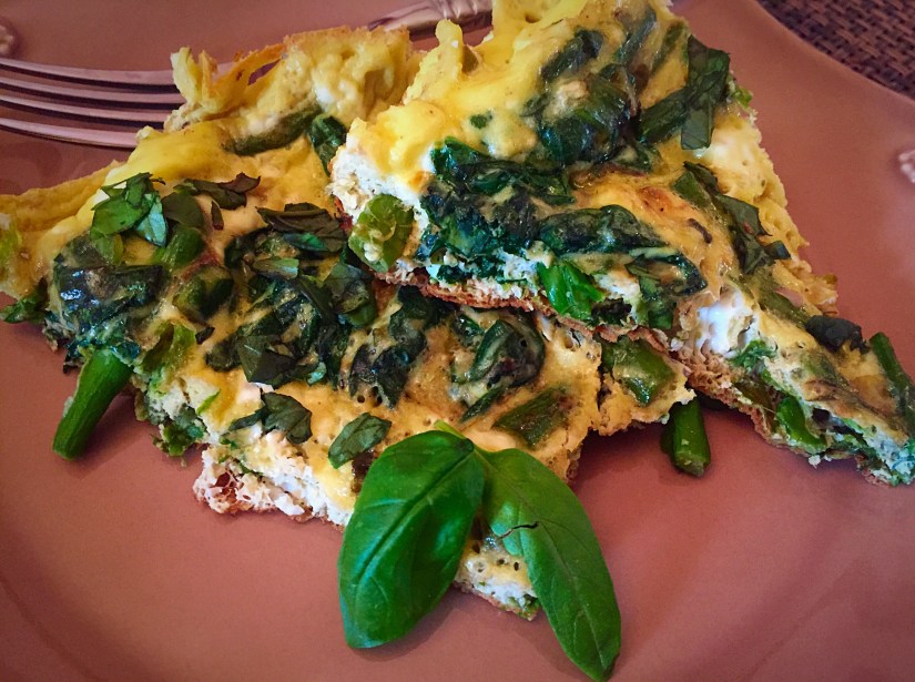 Remove your frittata and gently slide it on to a plate or pie pan; sprinkle with the fresh chopped basil!
