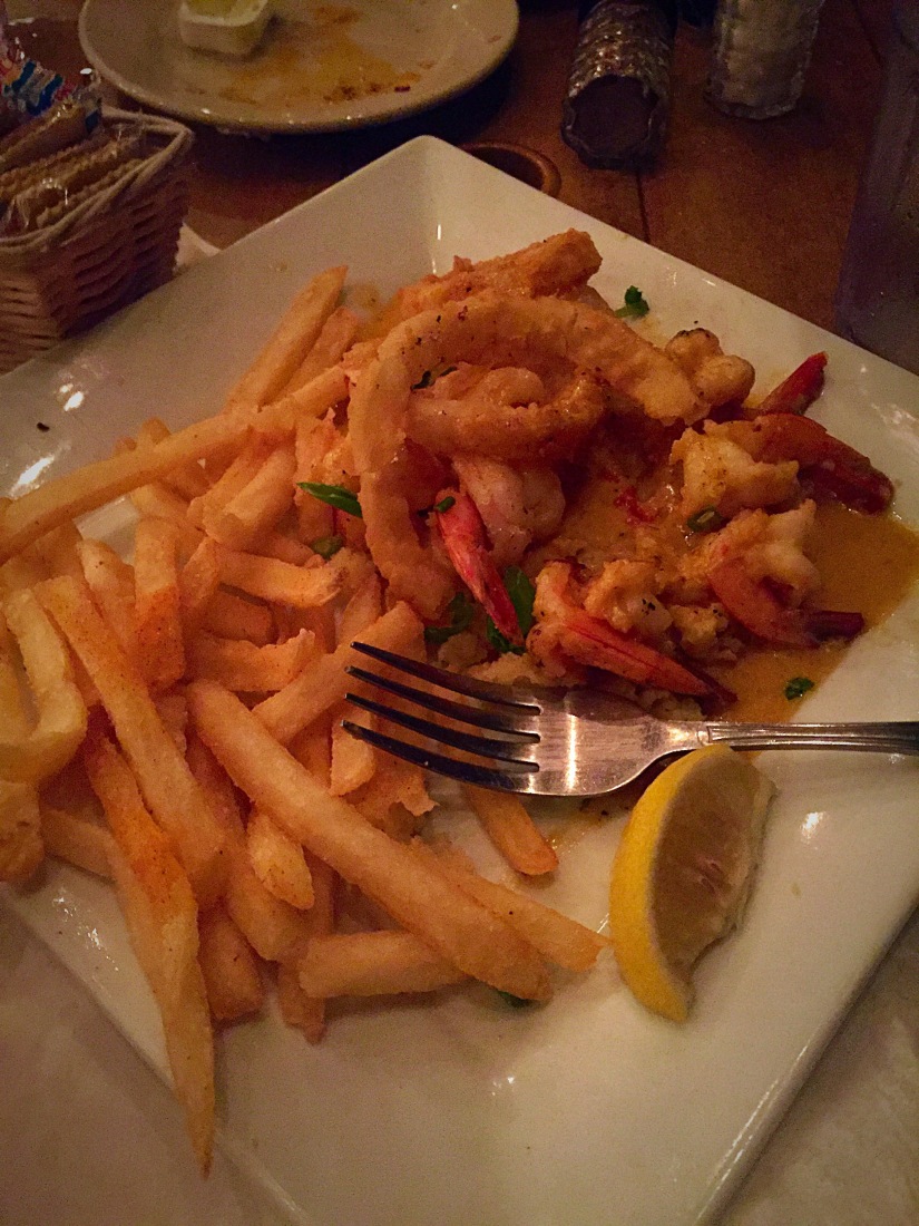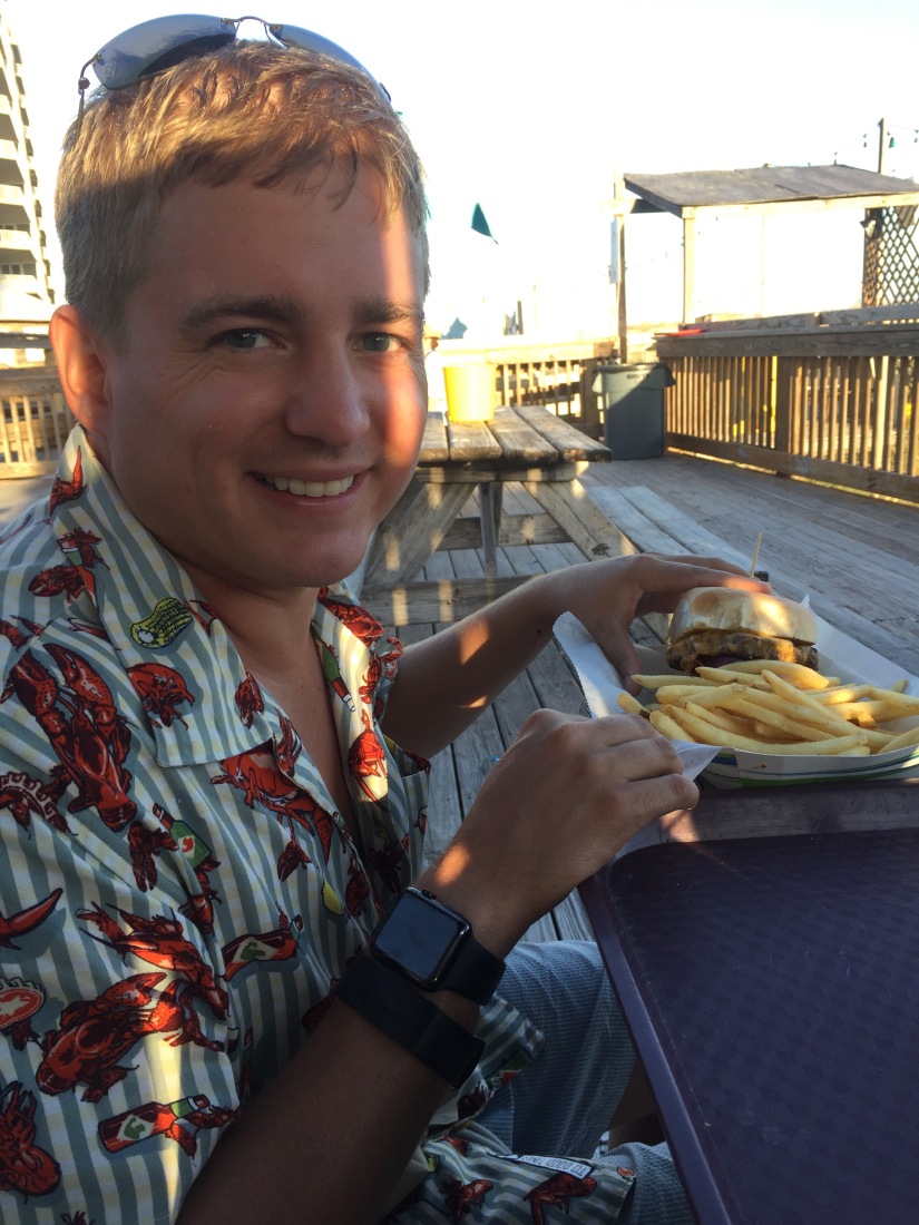 For dinner we went to the Oyster Bar and Grill. It was INCREDIBLY windy from the “almost very rainy day,” but we still chose to eat outside because we were at the beach and it meant we got to eat over the water and boat dock! The food was fantastic! We had barbequed shrimp as an appetizer and they were fantastic! It may have been my favorite thing to eat the whole trip. They were actually in a very runny sauce- not your typical barbecue sauce and the sauce was spicy and made with so many spices. I didn’t get a picture- things would blow away pretty easily- so we ate! Will had fried shrimp for dinner, I had shrimp and grits! Don’t mind the picture of him- we really couldn’t take good pictures here!