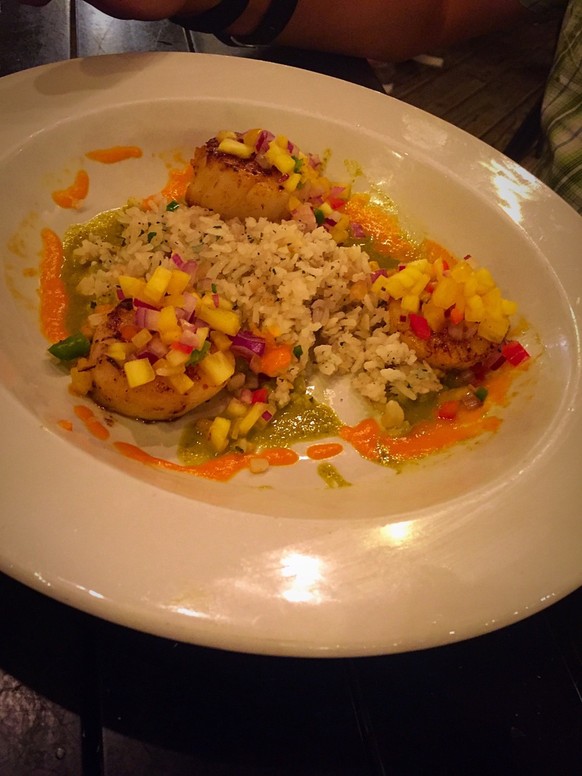 Dinner was at Cosmos. Cosmos is such a cut, fun restaurant and we loved it the first time we got to come to Florida in 2013. They happened to be playing live music and we managed to get a table outside once again! The food was great again. Will got scallops and toasted rice with mango salsa and I got Pecan-Crusted Redfish over dirty rice.