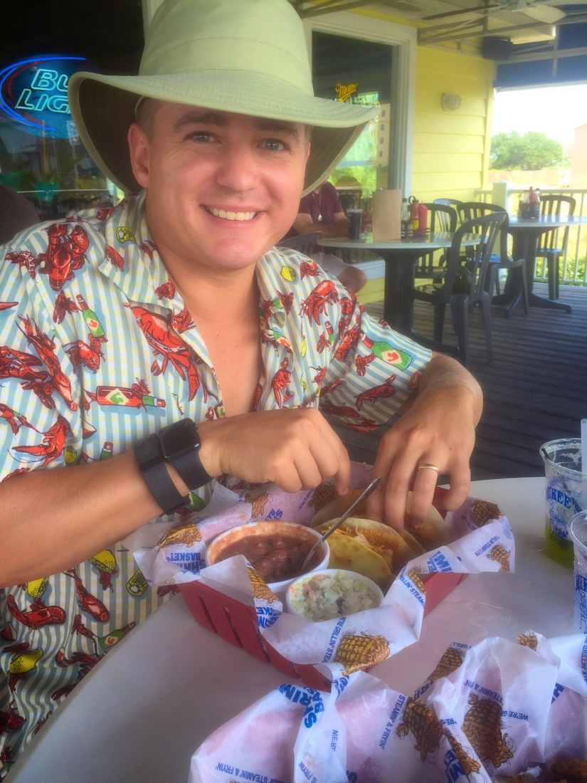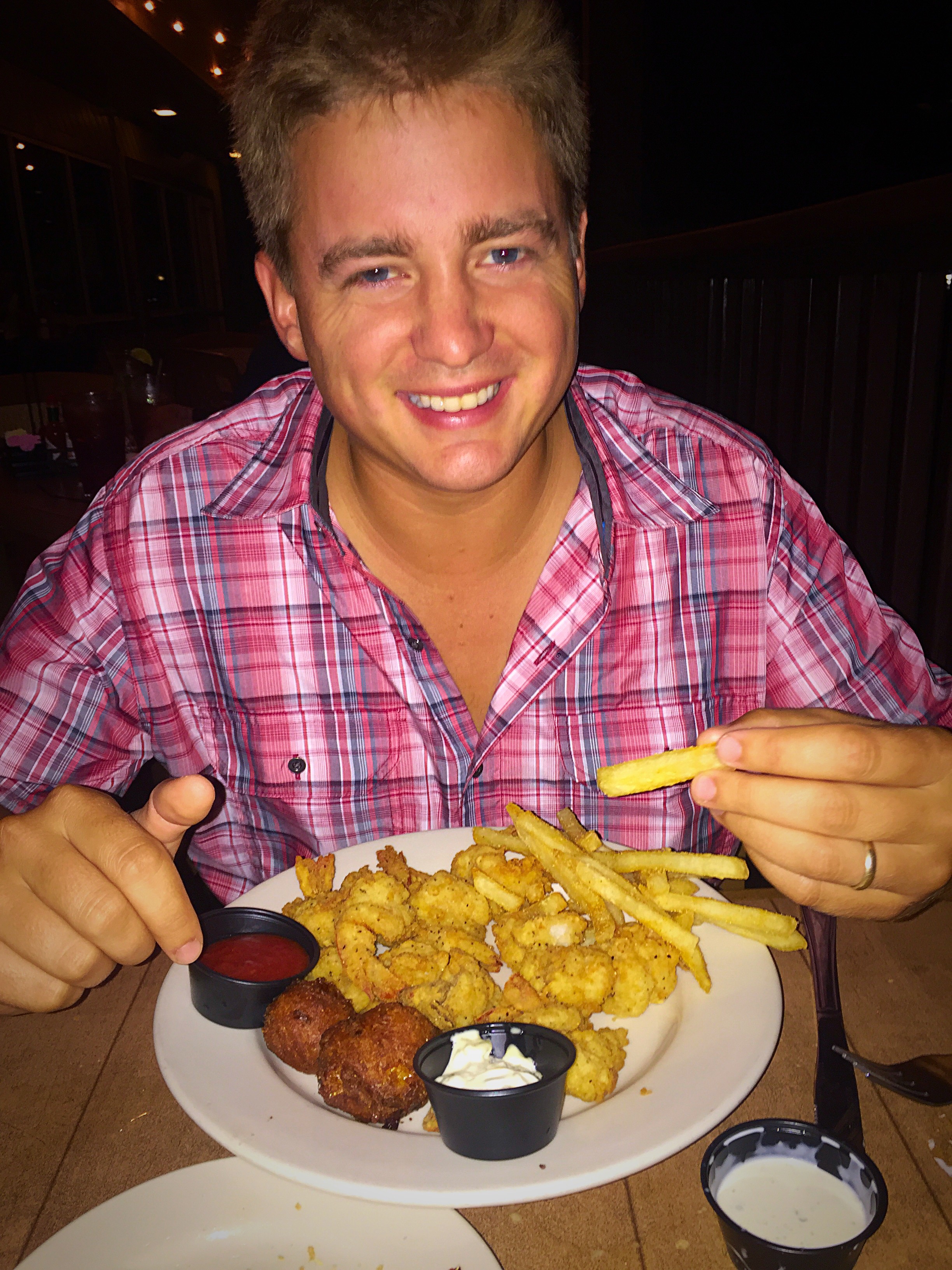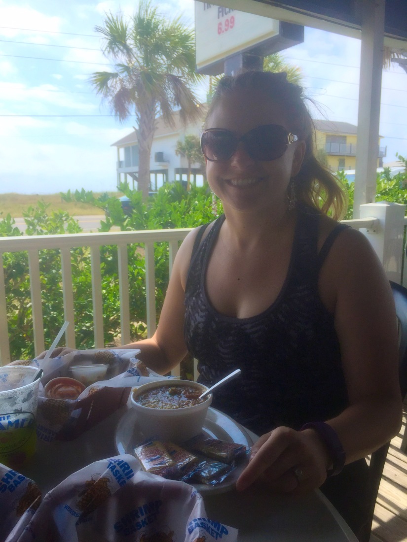 We attempted a day on the beach but it sprinkled some so we had lunch at Doc’s before heading to the store to get a few necessities. Lunch was wonderful! I had crab cakes and Will had red shrimp. They ended up being one of his favorite meals- so of course we got a picture of them! (Yes, they still have all the eyes and legs and everything on them!)