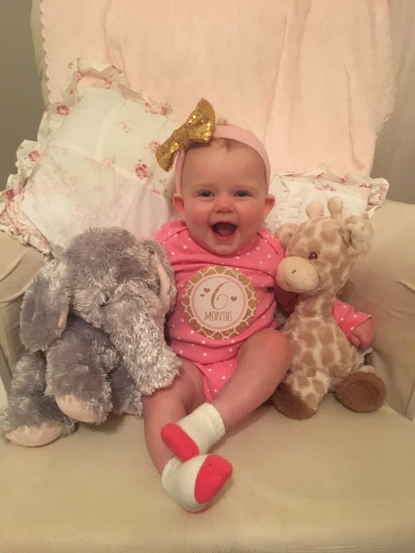 Six months of joy with our baby girl and it has FLOWN by. It’s hard to believe she is a half a year old now….!! She is weighing in somewhere around 14 pounds, and her length is somewhere between 25 and 26 inches long! She has an incredibly happy demeanor and has still had no trouble sleeping through the night!