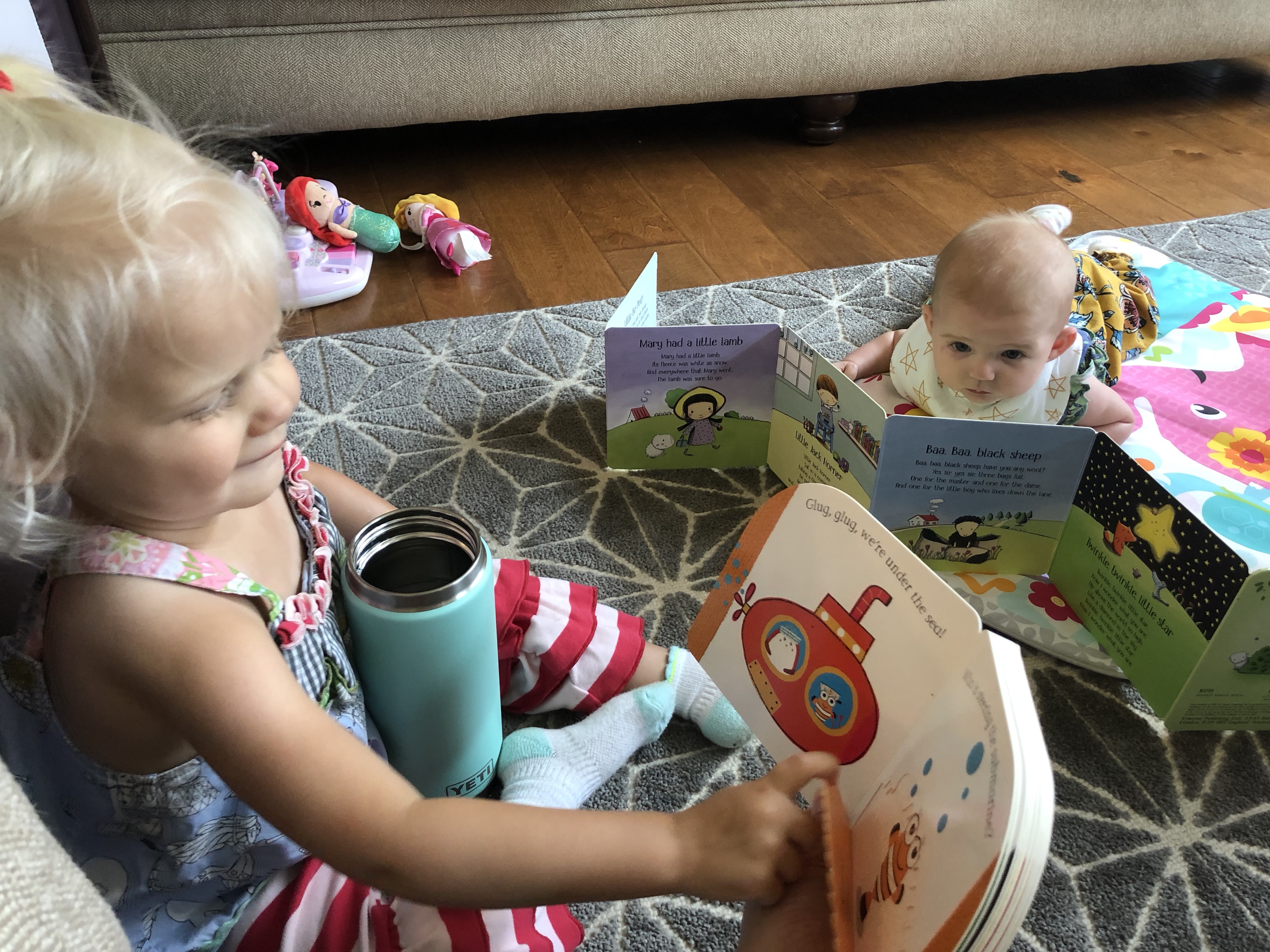 Eloise also got to sit in the Bumbo chair for the first time! Annabelle Grace was determined that ONLY she and Eloise would read books together. She did not want me holding Eloise or even holding the book- so- problem solved! Everyone seemed pretty pleased!