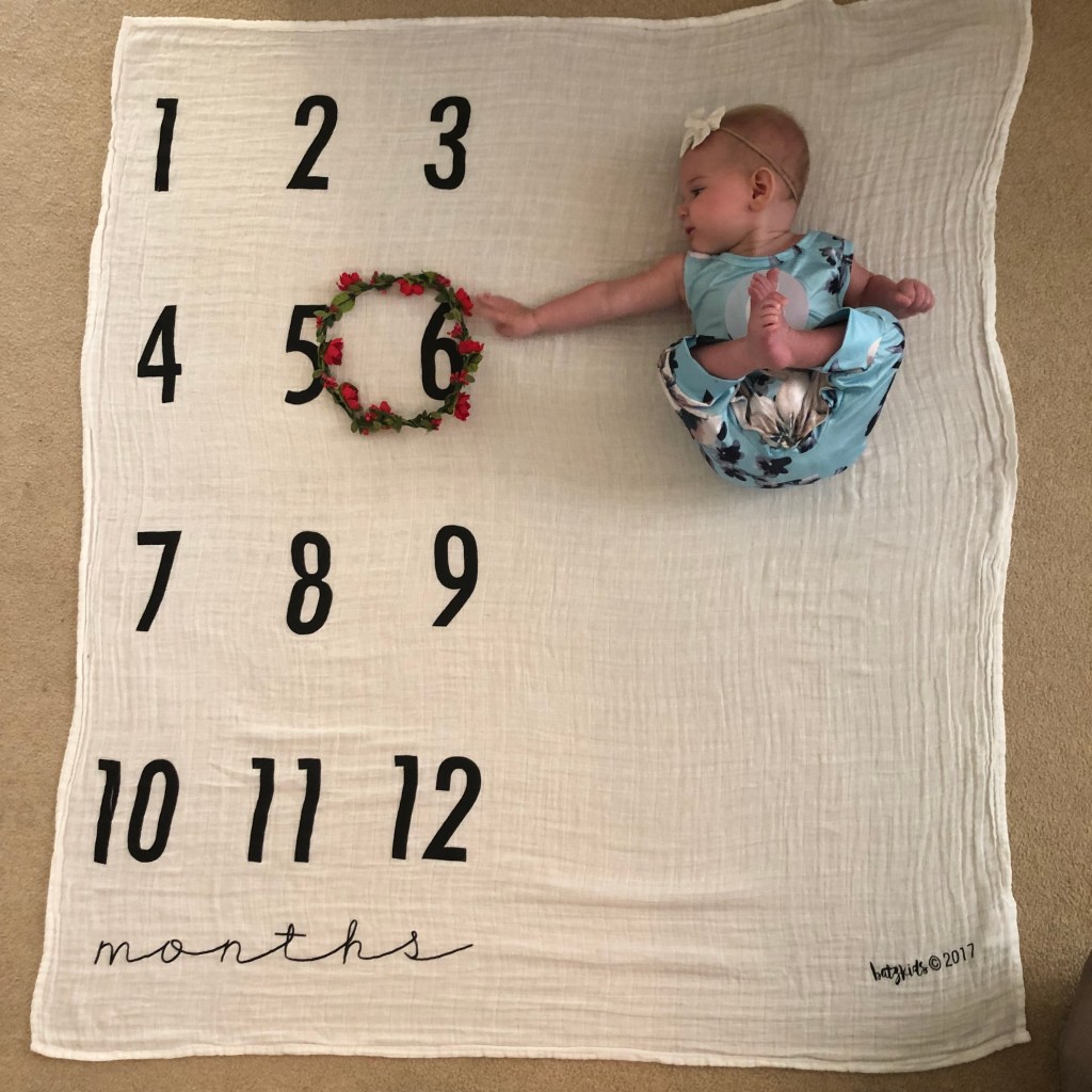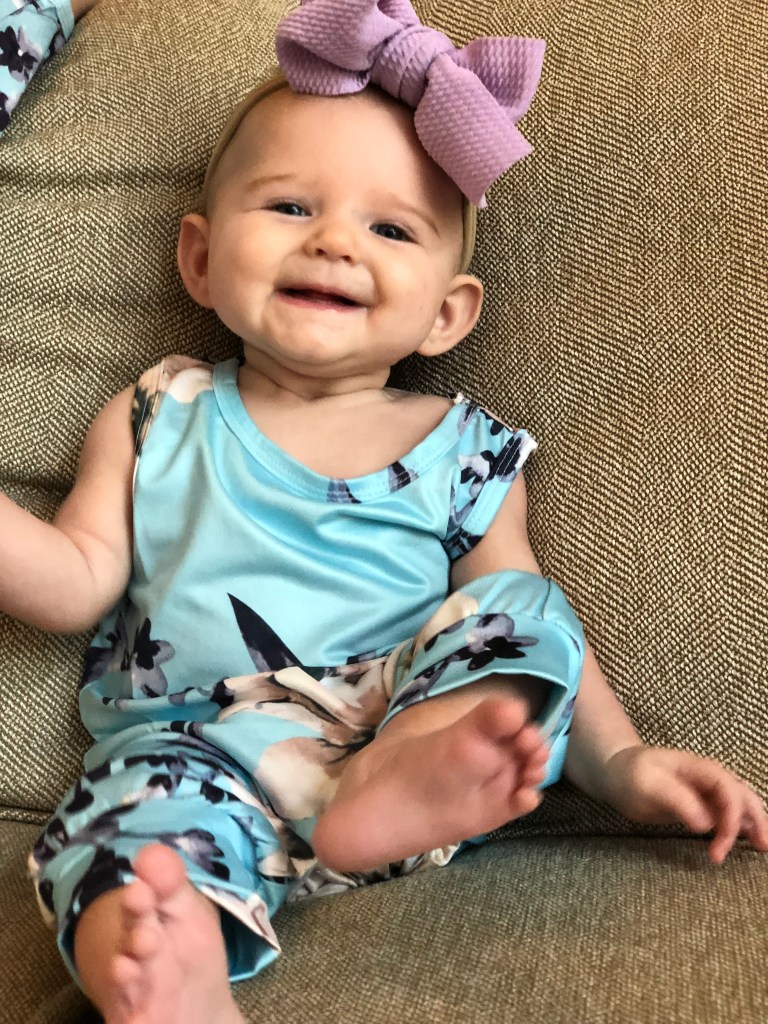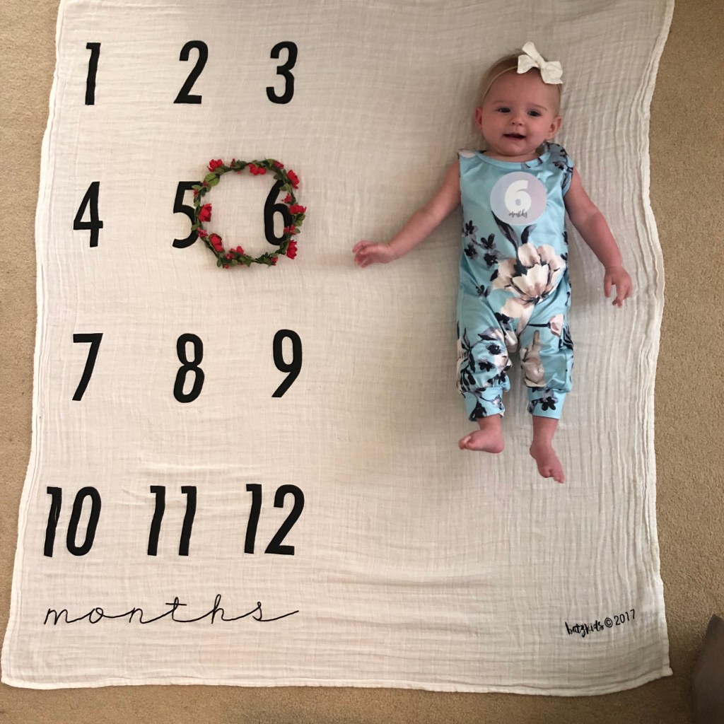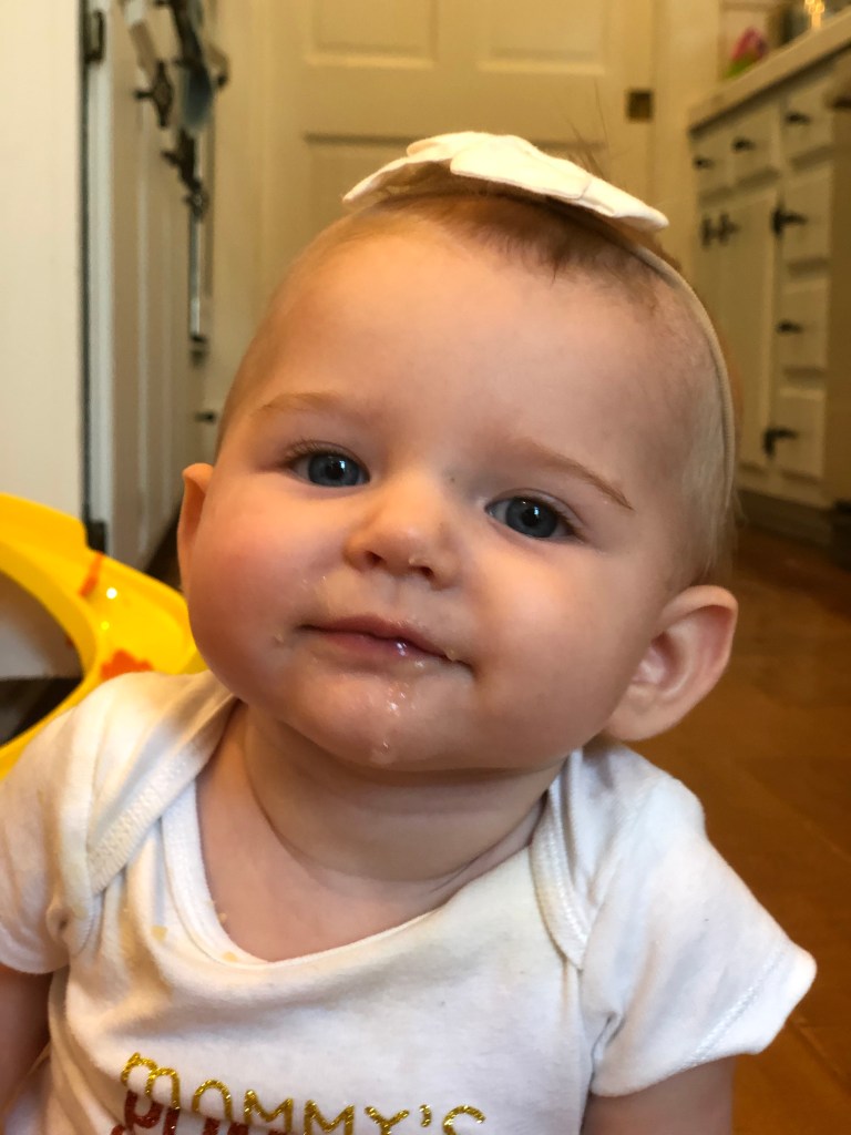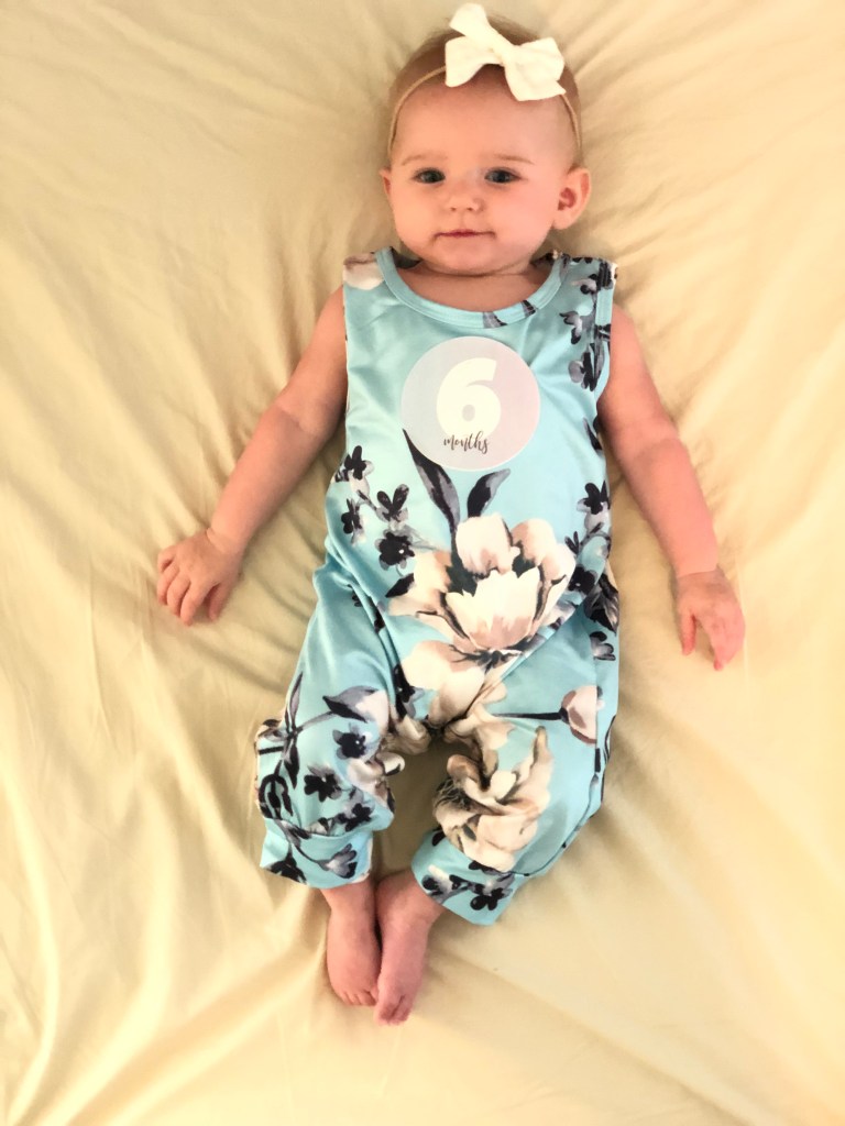 Eloise has made it halfway to ONE! Woo-hoo, Eloise!!! Turning six months old is always such a big moment! Babies get to try FOOD for the first time! We have followed Baby-Led-Weaning with both of our girls, so they didn’t get food at all until their 6 month birthday (side note- Eloise technically started food about a week earlier than her birthday- she was born at 41+1 days, so her true 6 month birthday would have been September 19!), and they had to be able to do three big things before that too. or we would have waited even longer-(we also don’t let them have the food “earlier” according to their original due date, unless they can do the big three!) the biggest one- being able to sit up, unassisted for one whole minute. So, as you can guess, Eloise learned how to sit this month! Around September 5-I was finally able to get one, 40 second sit out of her, and that just isn’t long enough, plus all the other “sits” were 11 seconds, consistently. I actually was sure she was going to wait and miss her 6 month birthday, and it was almost funny…… I jokingly told her one day, “Eloise, no food for you, unless you can learn to sit up and do it for a whole minute!” Guess what- within 3 days, September 8, Eloise sat 2 whole minutes, and then did it again later that same day for another 2 whole minutes!. Like most other months, I swear she truly has her own agenda, and does things on HER time! Turns out, food seemed to good to miss out on!