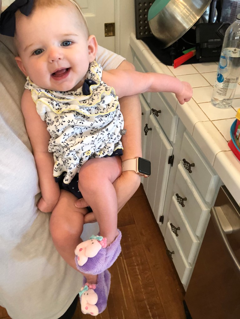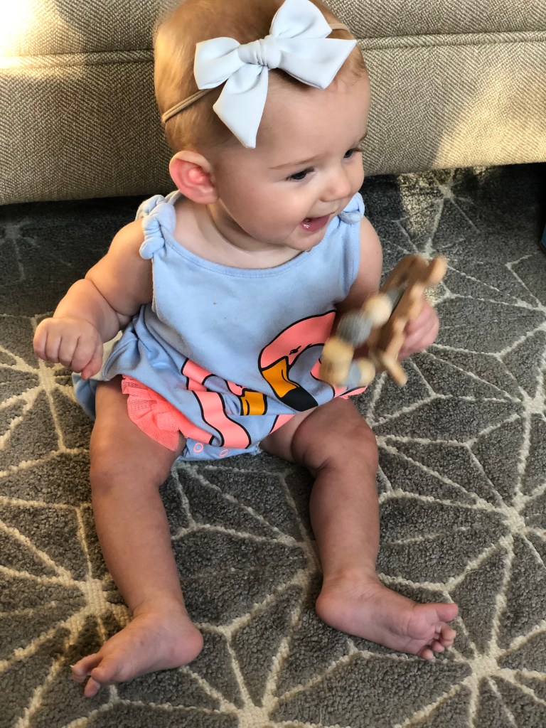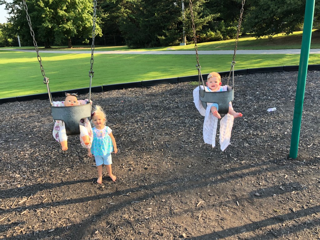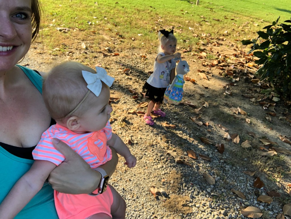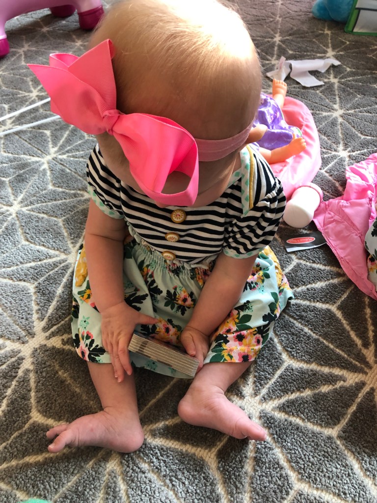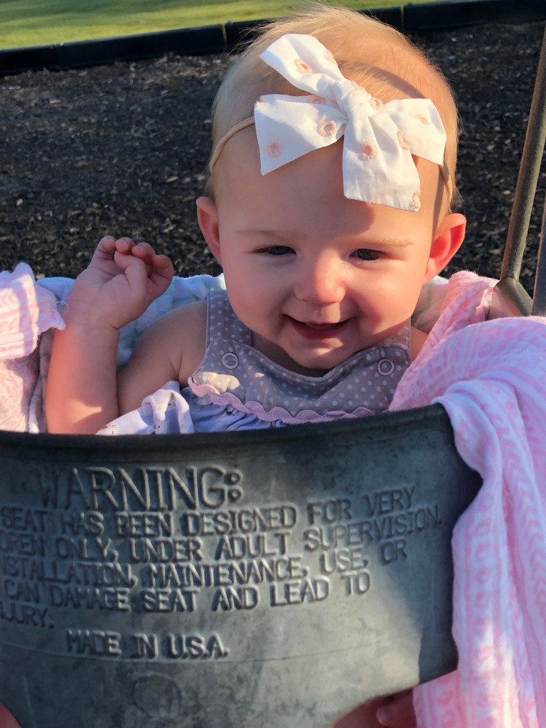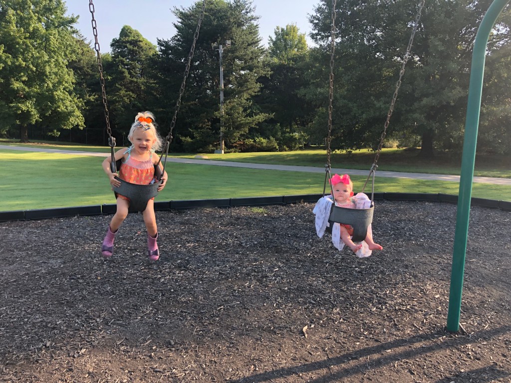 The girls and I also spend a TON of time outside! We head to the park most mornings to stroller walk and then play. Eloise is still napping three times a day, but every now and then, she is awake to come out too! She got to swing in the bucket swings for the first time and now LOVES swinging! We also play in the yard a ton, and walk up and down our drive way….well, Eloise doesn’t walk…. ha.