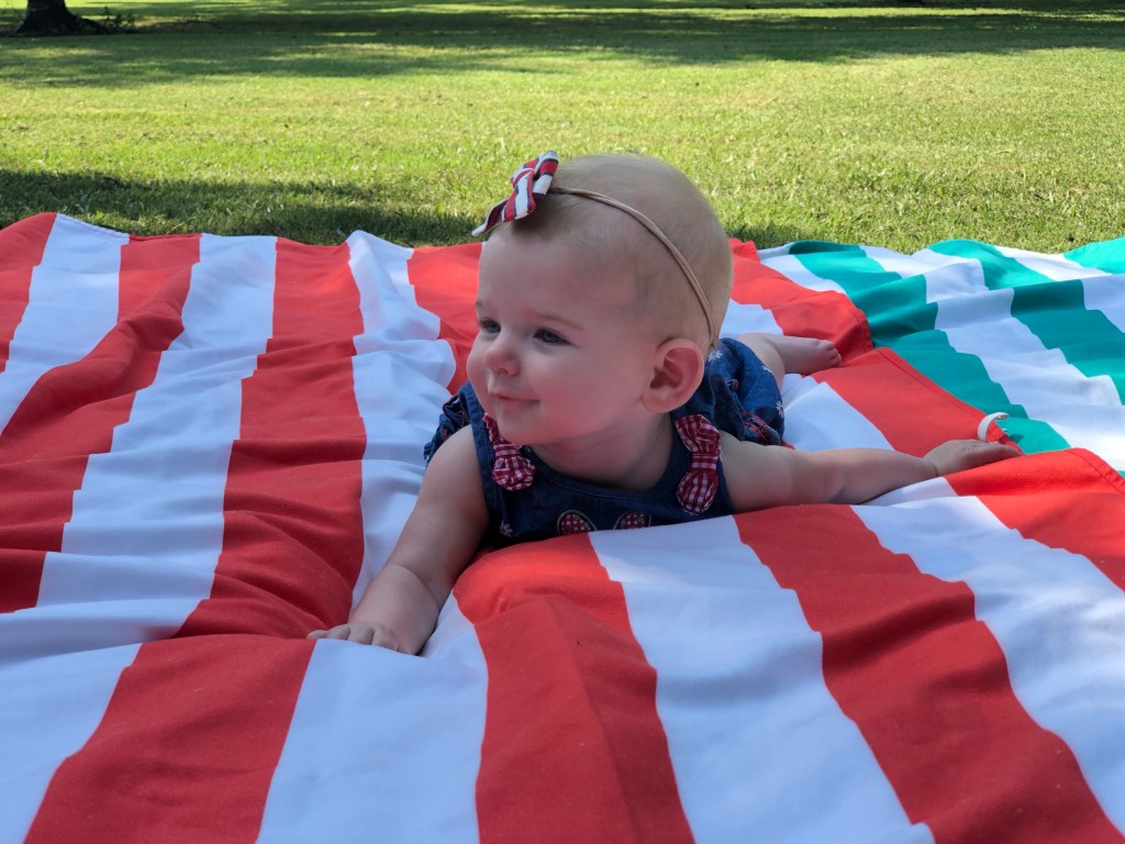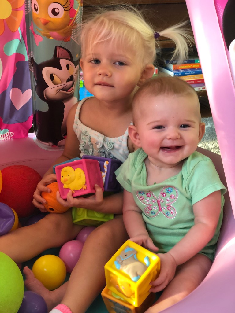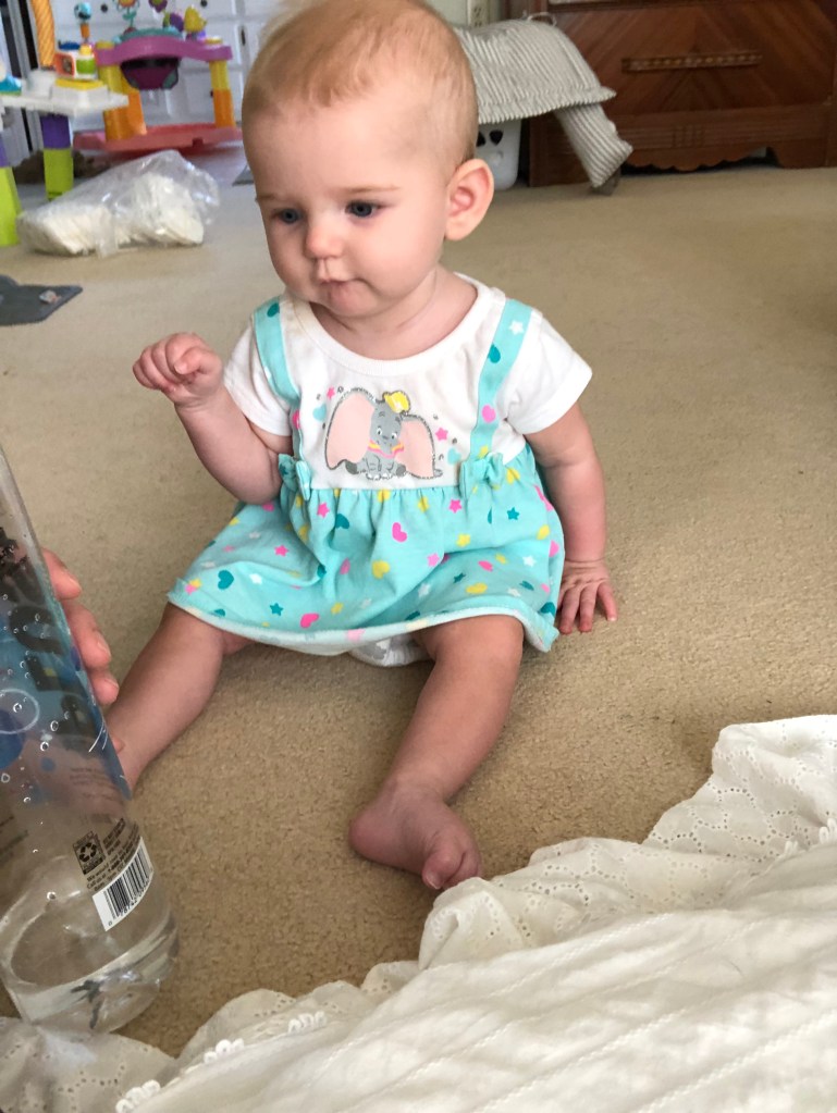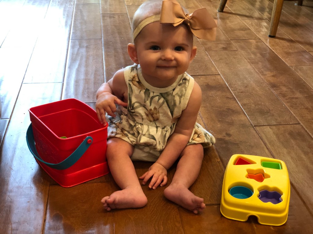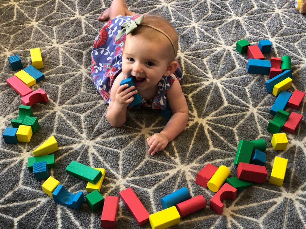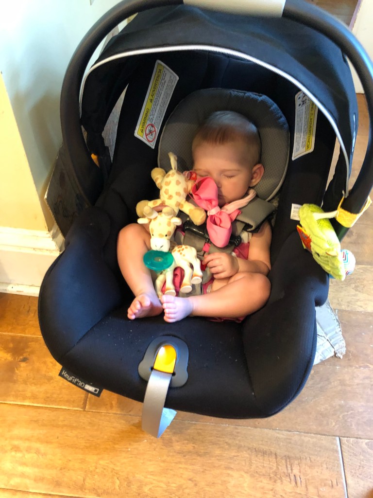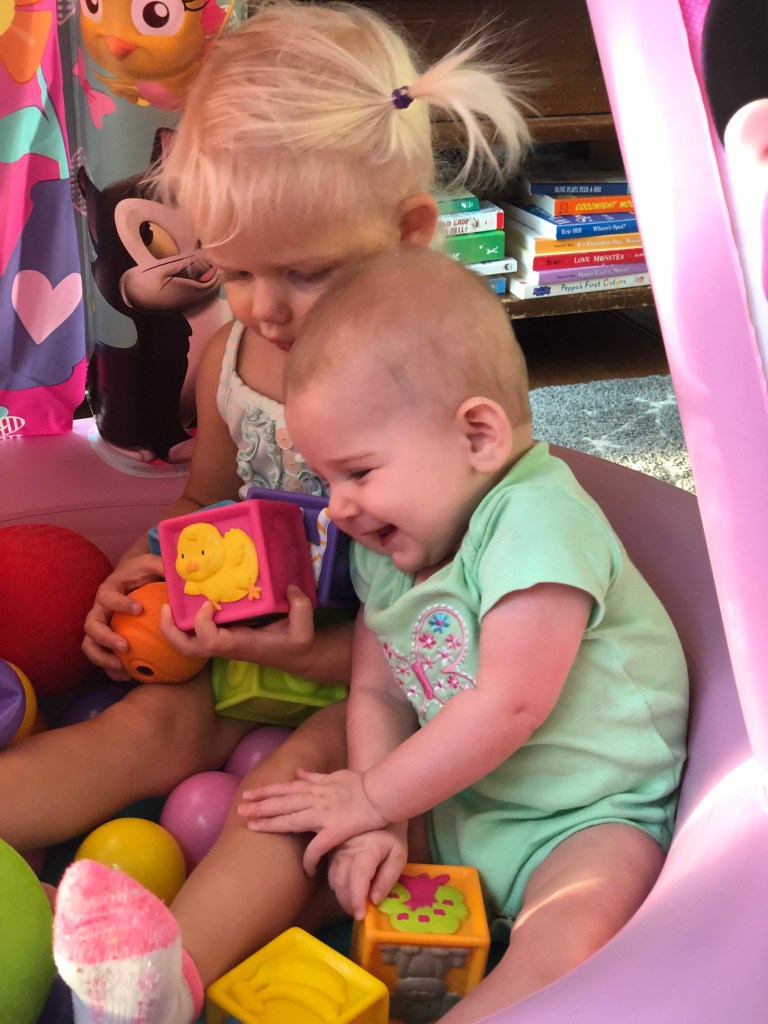 The girls and I also spend a TON of time outside! We head to the park most mornings to stroller walk and then play. Eloise is still napping three times a day, but every now and then, she is awake to come out too! She got to swing in the bucket swings for the first time and now LOVES swinging! We also play in the yard a ton, and walk up and down our drive way….well, Eloise doesn’t walk…. ha.