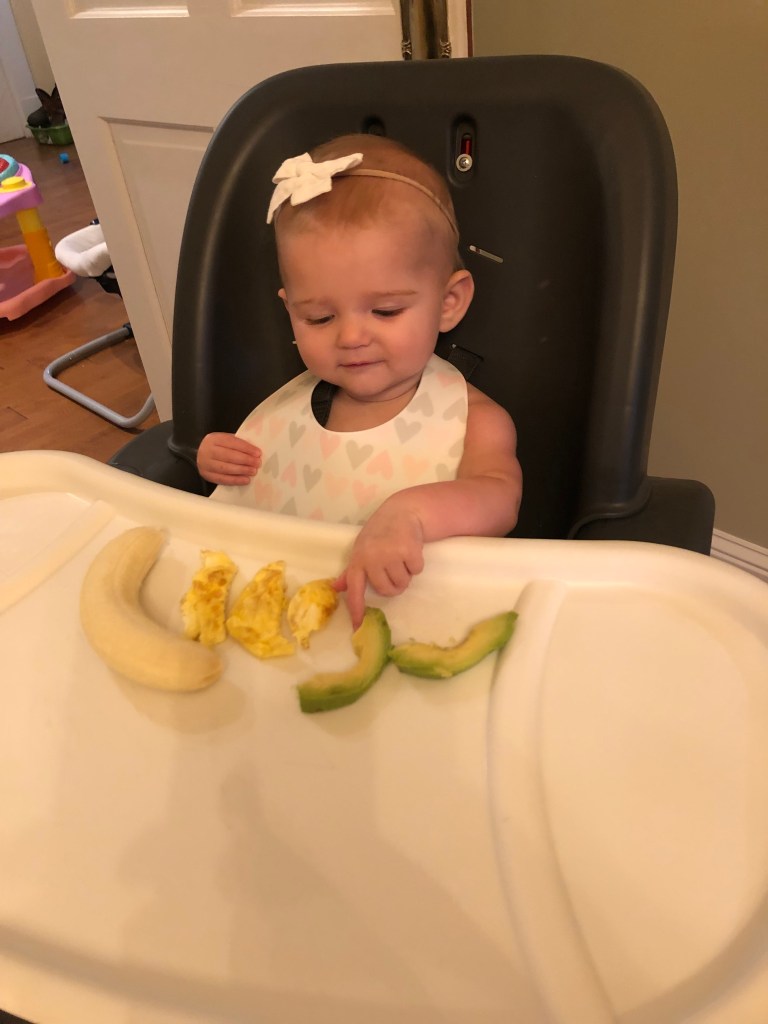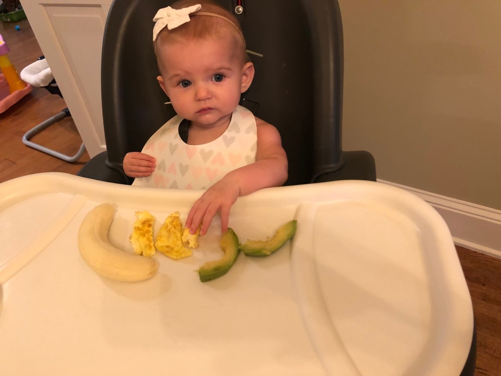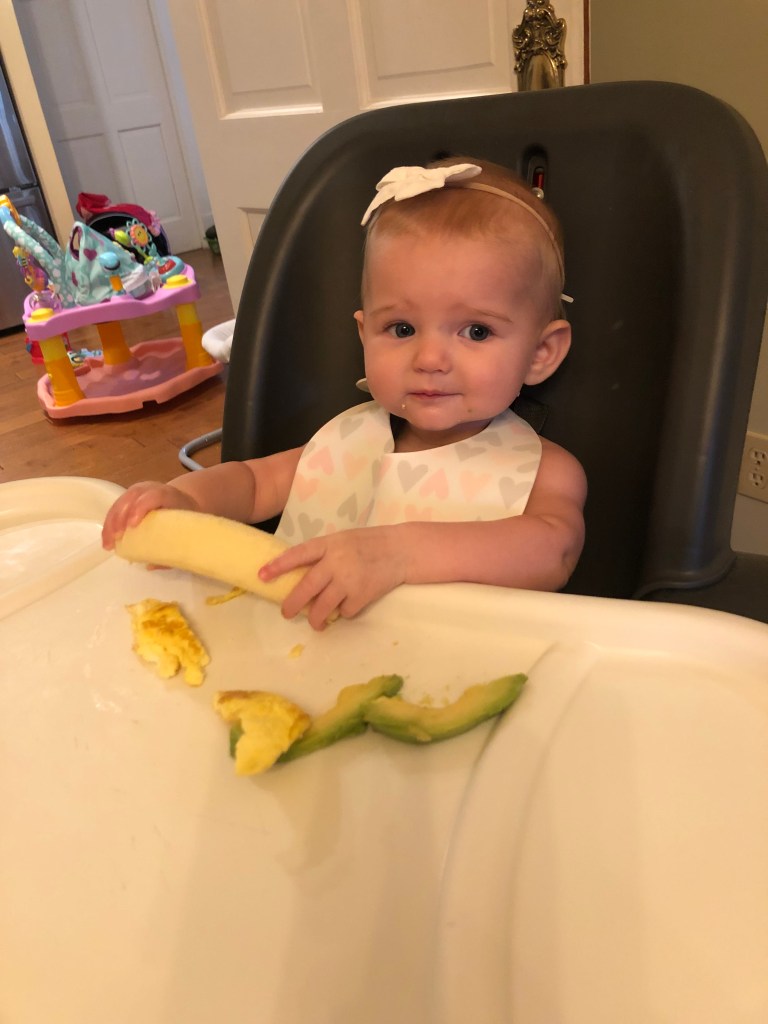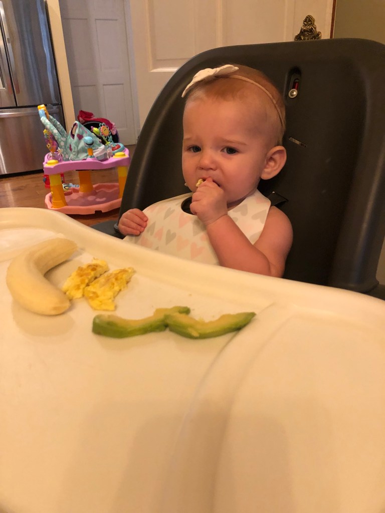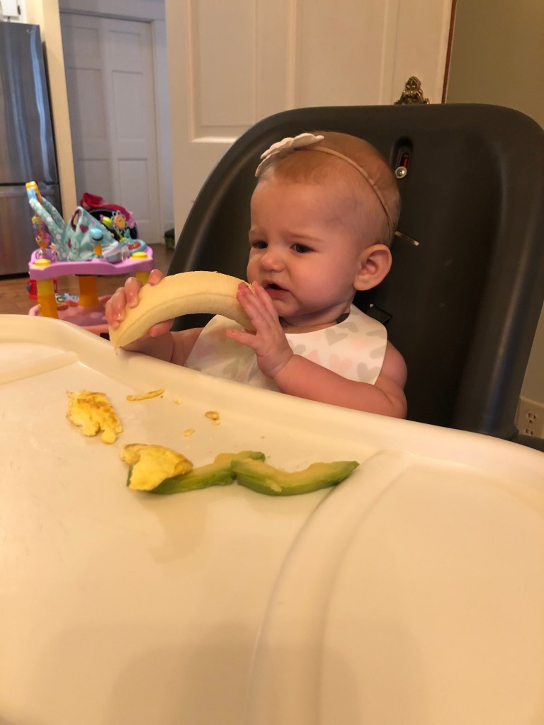 By the way, when September 19 rolled around, Eloise was sitting like a CHAMP. So, she got to try her first meal! We started with breakfast and served up bananas, eggs, and avocado! She seemed to really like the eggs!