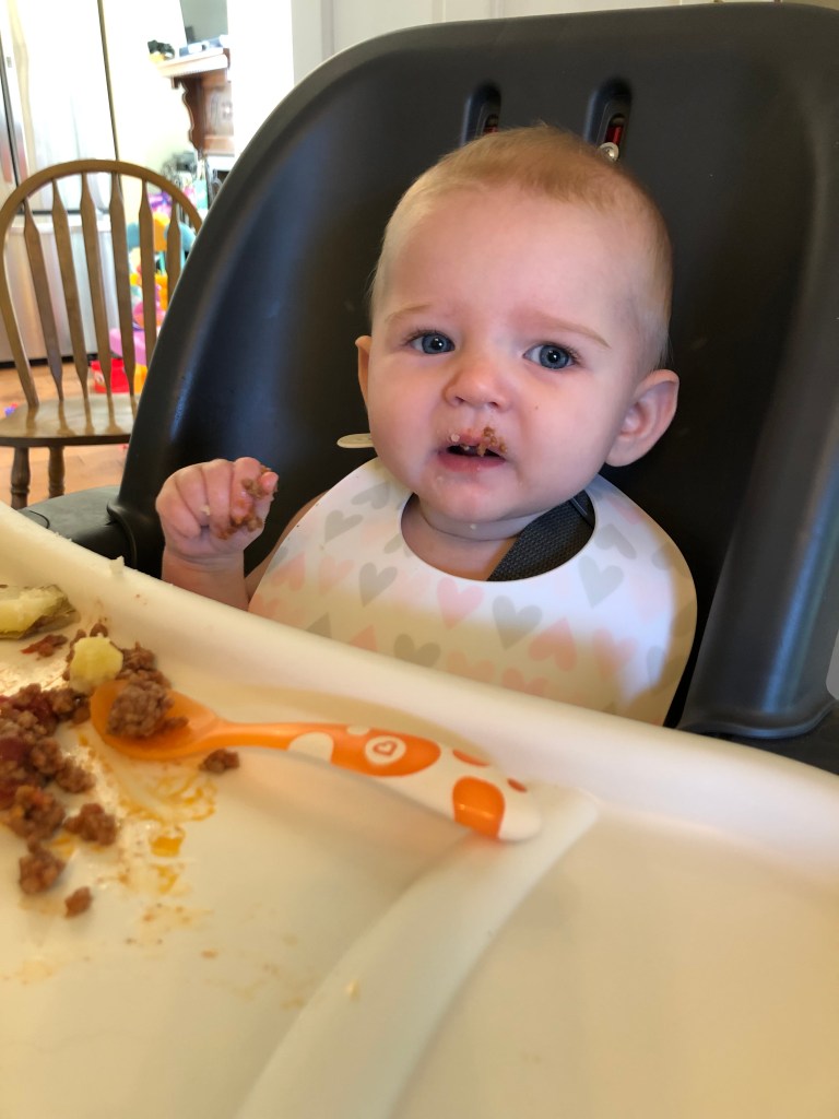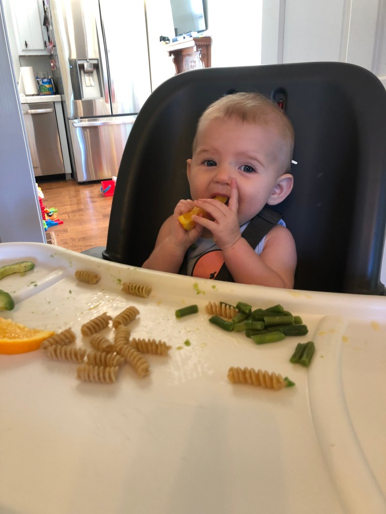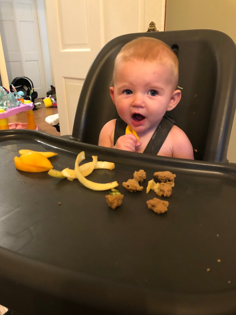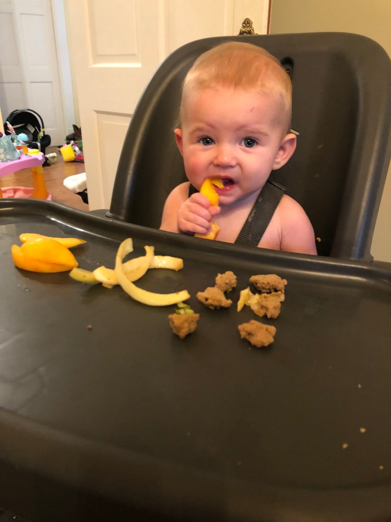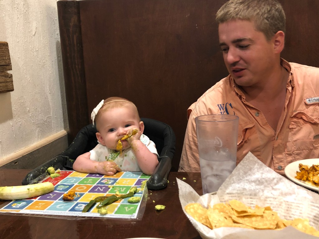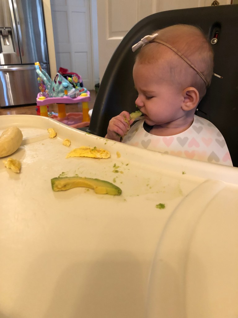 The rest of the month was equally as exciting watching Eloise try more food! We seriously just love the expressions! Plus, seeing a child be their own person, and learn how to independently eat is just so cool! (If you aren’t familiar with BLW- you never feed the baby yourself, and the baby also never has baby food. They move straight to eating actual solids, or pre-loaded spoons!) Eloise has so far, LOVED food. I haven’t found anything she turns away, and she is eager and quick to try anything and everything! We’ve even ventured out for some fun foods- mexican, chick-fi-la, and pizza! It took about 5 days and she did have her first gagging experience, and handled it like a CHAMP! She worked out what was stuck, and was smiling and ready to eat more immediately! For the last couple of months I have been avoiding dairy, because Eloise did have a few bloody diapers a couple months back, dry skin, and could be a little touch and go with sleep. It did seem to help cutting it out, so I think it was worth it. We’ve slowly been working it back in to my diet and are easing it back in to hers! So, here are some more pictures of Eloise eating, because, why not?!