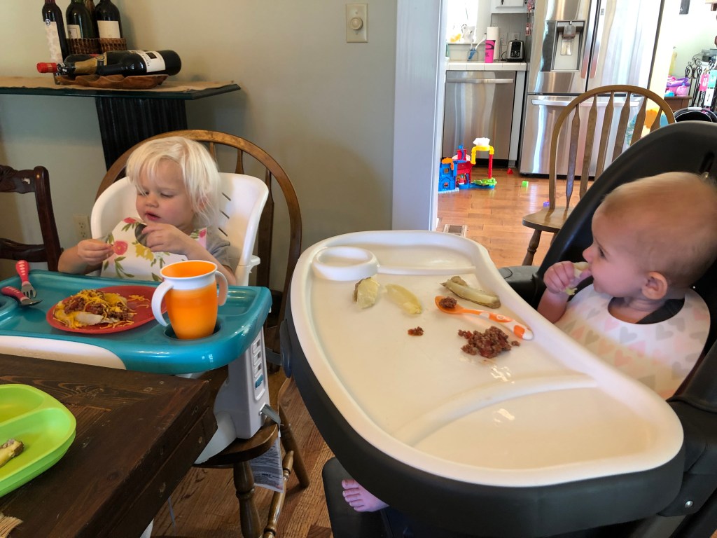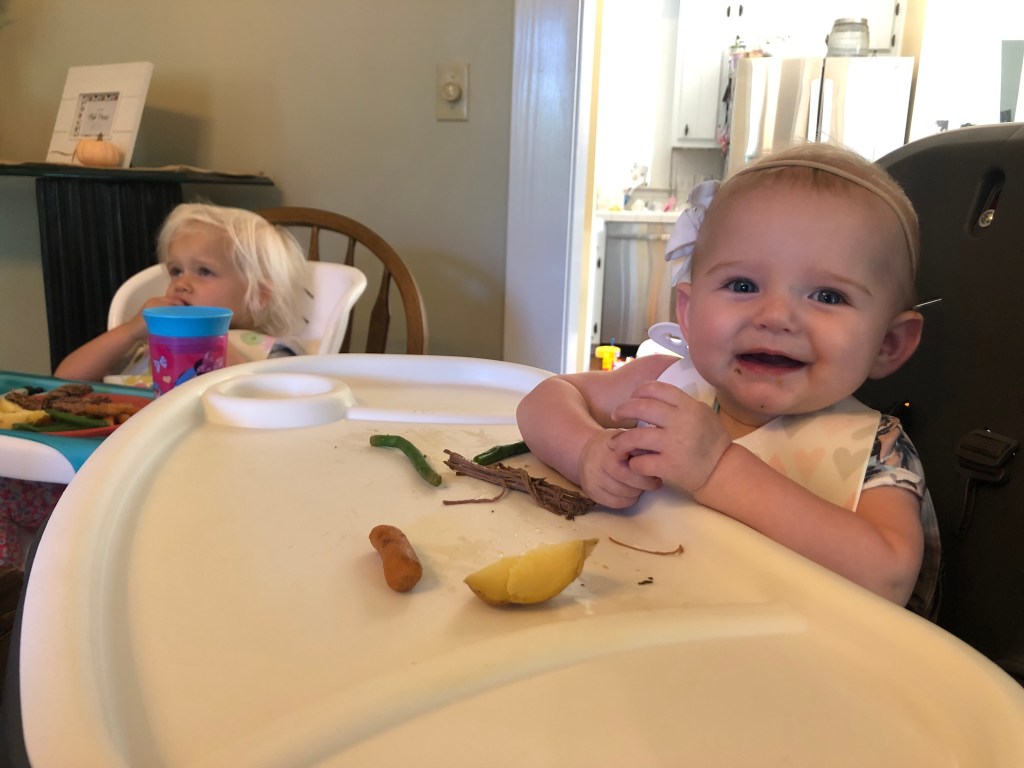 We also usually just jump right in with Baby Led Weaning. Since I am at home with the girls all day, and I have to eat too, it is easy to have us sit at each meal and try it out, straight from the beginning. (Don’t get me wrong- even for a stay at home mama, and farmer daddy- it IS TIME CONSUMING) Most people start with one meal a day with their little(s) and progress to more over the next 6 months. My thoughts are….I may as well knock it out, and again- I’m having to eat anyhow…so may as well work around their schedules.